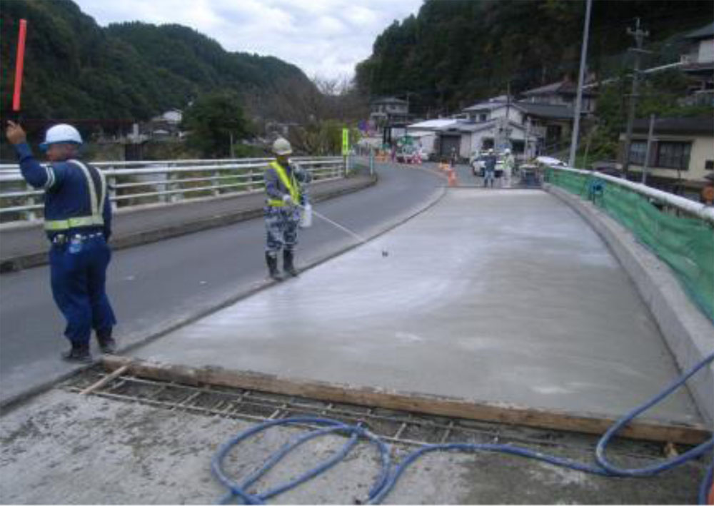 また、施工性を確保しつつ工期を短縮するため、速硬性混和材「Facet」を混入したコンクリートを打設した。同コンクリートは6~12時間で24N/平方㍉の強度を発現できるコンクリートで可使時間も調整剤(ファセットセッター)を用いることで1時間程度まで確保できる。現場での混練が可能なためジェットコンクリートのようにプラントも必要がない。打設後のコンクリート養生は、メーカー推奨の養生材を散布した上でシート養生を24時間程度行っている。