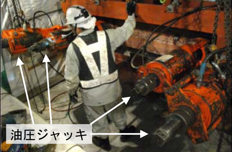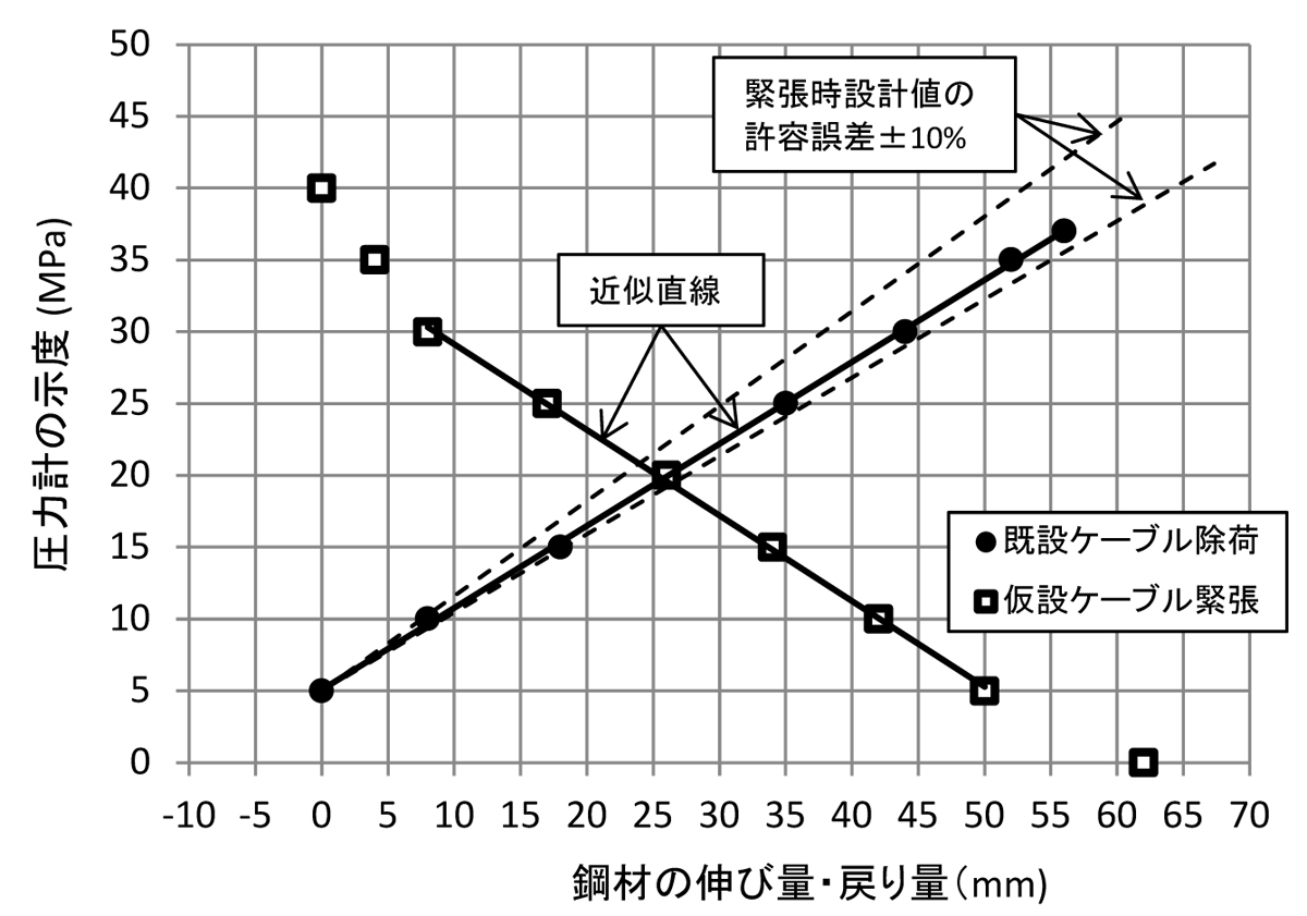具体的には仮設材は既設ケーブルの外側に仮設ケーブル、仮設定着梁、仮設偏向装置を設けて一度仮設ケーブルに張力を移し替えてから既設ケーブル部材を撤去した。張力の移し替えは既設ケーブルの除荷と仮設ケーブルの緊張を各2基、合計4基の油圧ジャッキを用いて同時に行い、除荷する既設ケーブルの張力と導入する仮設ケーブルの張力の合計が施工前の張力と等しくなるように管理しながら施工している。5MPa毎に仮設ケーブルの緊張・既設ケーブルの除荷を交互に行っていった。