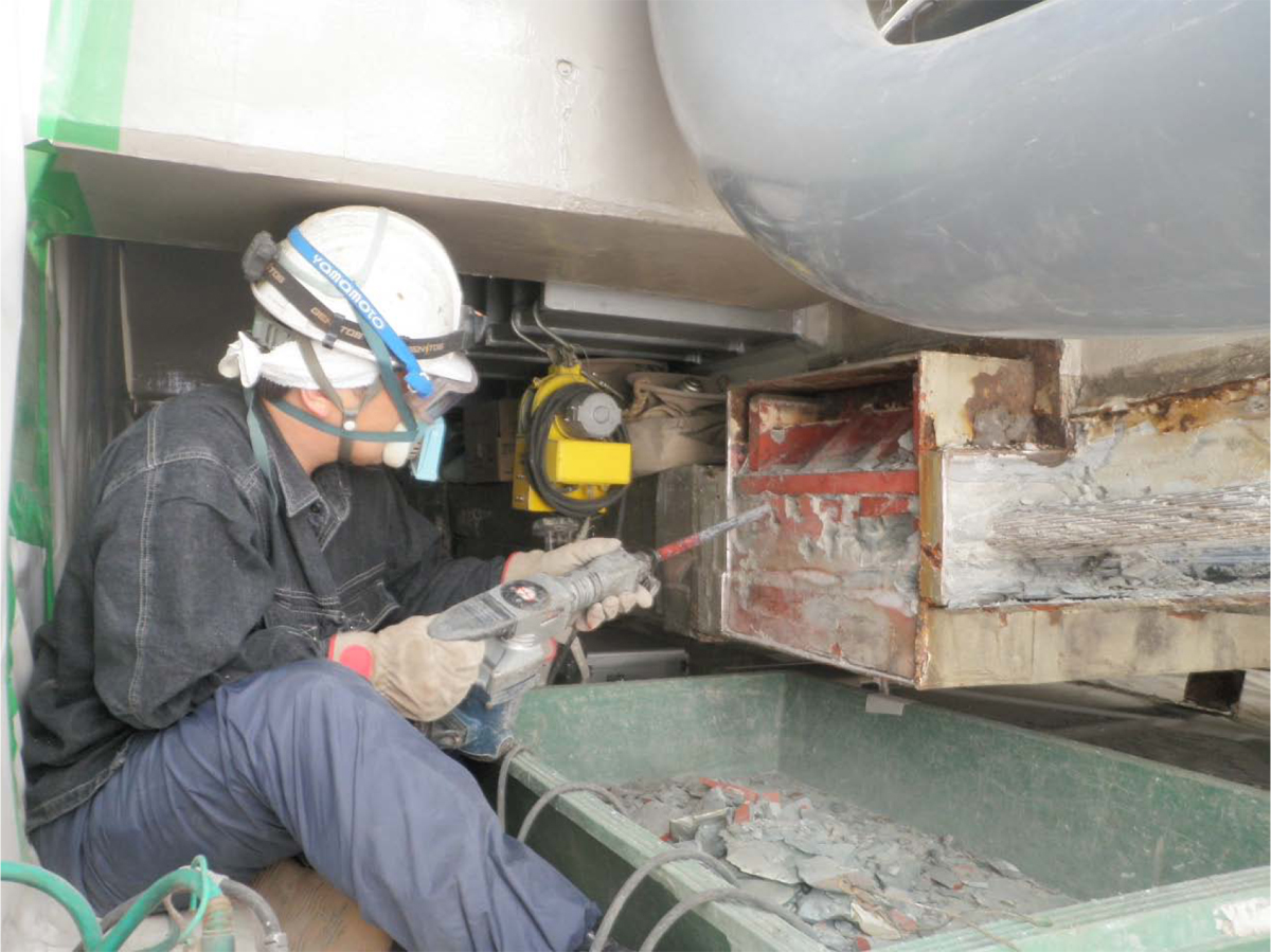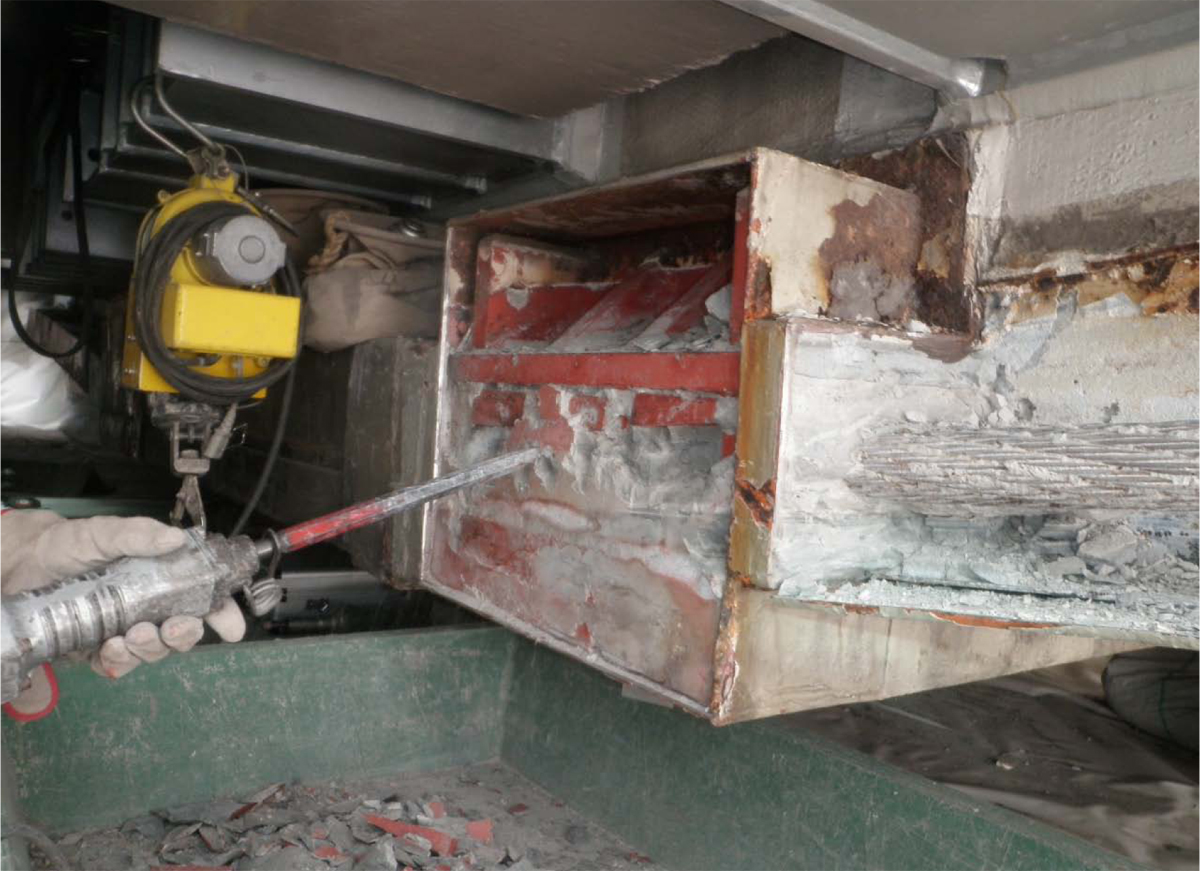 足場を機械足場にしなかった理由は、一度グラウトをはつり(グラウトのはつりは電動ピックを使用した)取らないと緊張力を抜くという作業ができず、はつりは一日ではとても全部取りきれないので、機械足場では、残った部分を桁下(即ち側道や交差点部)にさらすという結果になってしまい危険すぎるためだ。