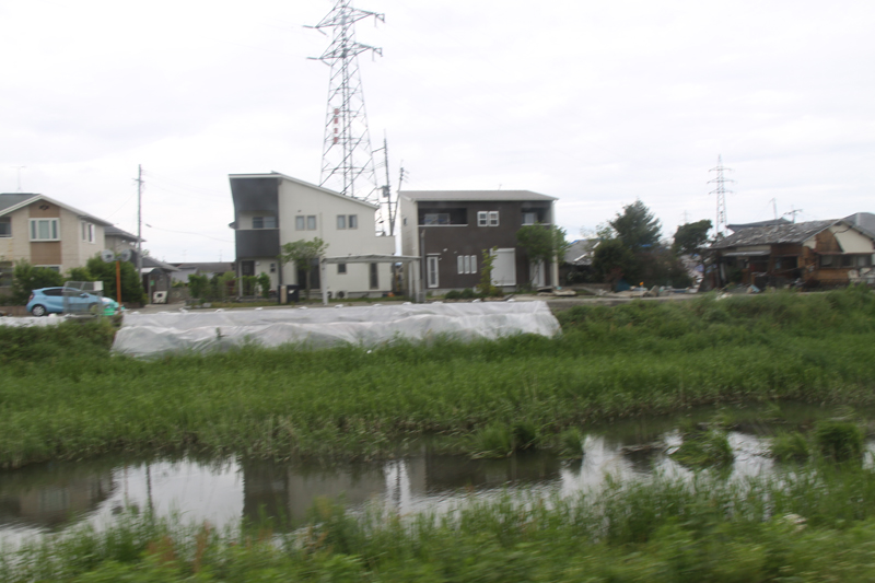 さて、秋津川南岸(左岸)に沿って走ると北岸(右岸)が酷く損傷していることが分かる(左写真)。振り返ってみると木山川も同傾向にあり、地震の特徴が出ている。そして、惣領橋(益城郡益城町惣領)を渡ると風景は一変していた。今まで通過していた箇所は田園地帯が多く、家屋の損傷の程度は分からなかった。同行者も熊本市内しか足を運んでおらず、益城町の秋津川北岸地区の家屋の損傷には絶句していた。良く見ると1階が崩落している家屋、駐車場の車がつっかえとなって支えている家屋などがある。阪神大震災の記憶がフィードバック(記者は当時、関西在住で友人が多く神戸に住んでいた)する。お互い無言。カメラのシャッター音のみが響く。