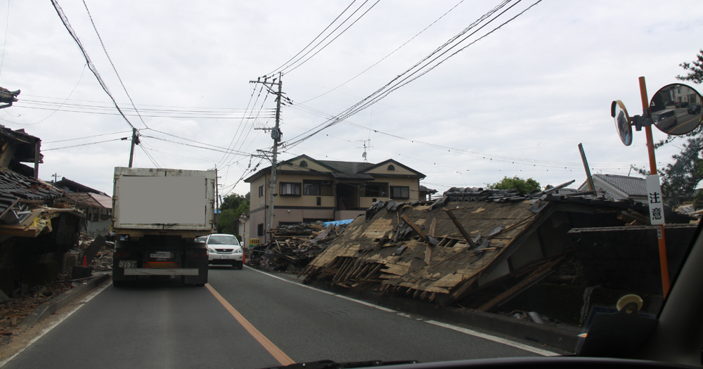 車はひたすら西へ、益城町杉堂の荒瀬橋を通過し、日真寺に向かう箇所で道路は転石や倒木により不通となっていた。道路右側の斜面は土砂崩れを起こしている。「危険を無視すれば徒歩はできるが、車はとても無理」とは実際に歩いていた人の弁。