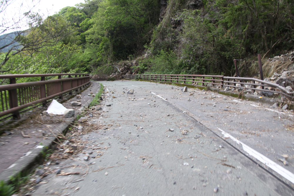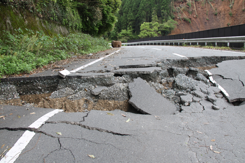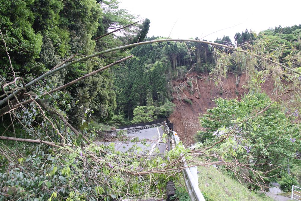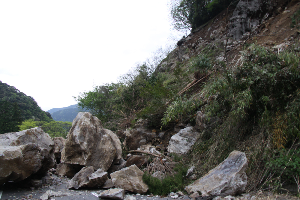 ひび割れを起こしている法面/巨岩や倒木が道路を覆う