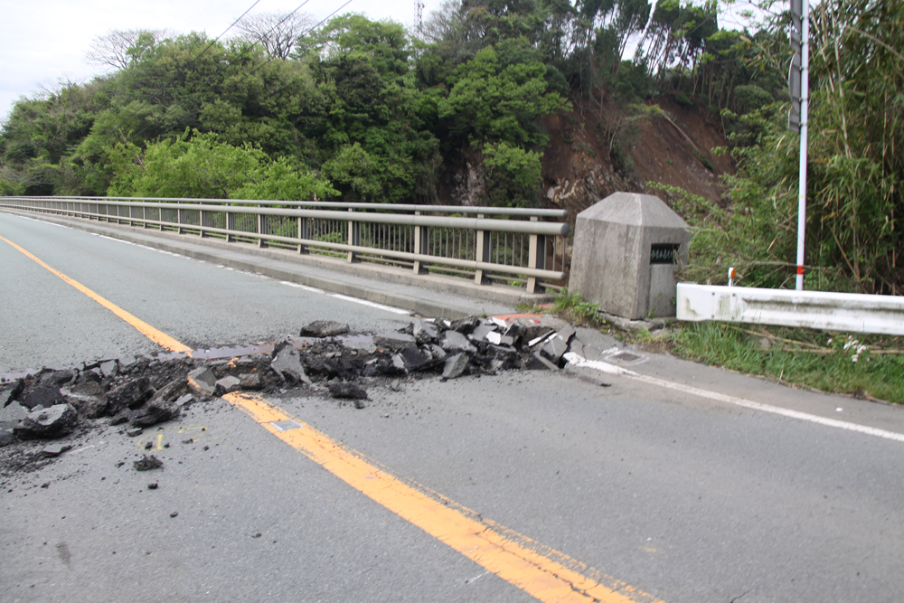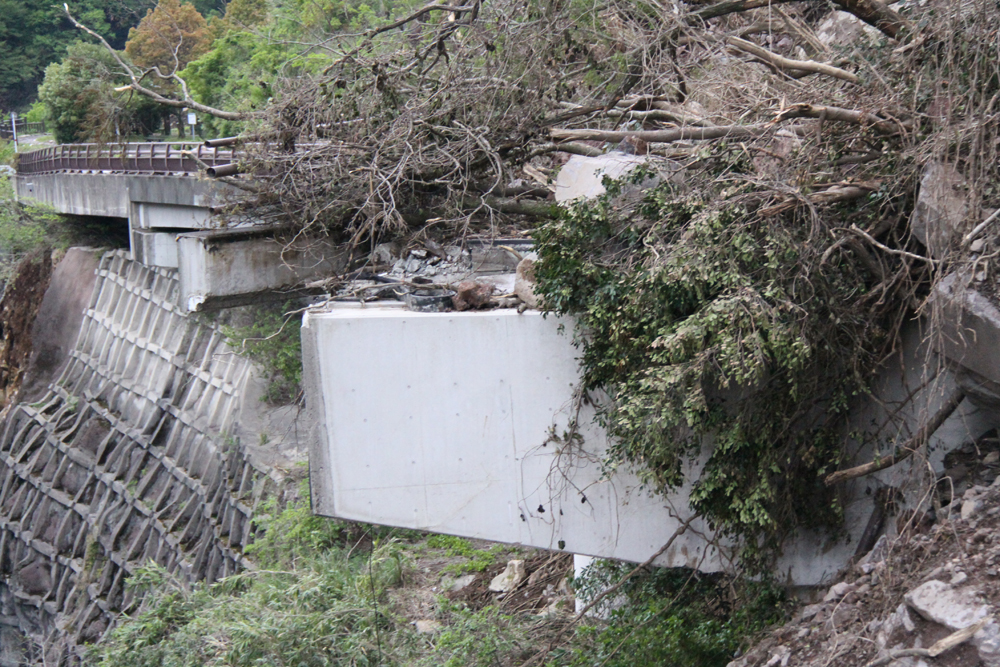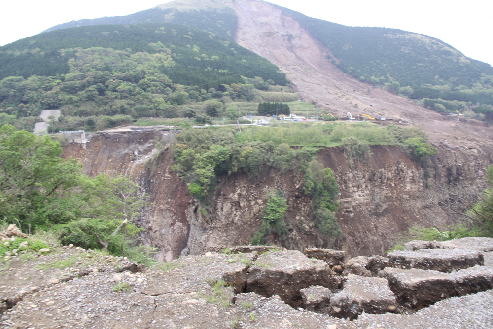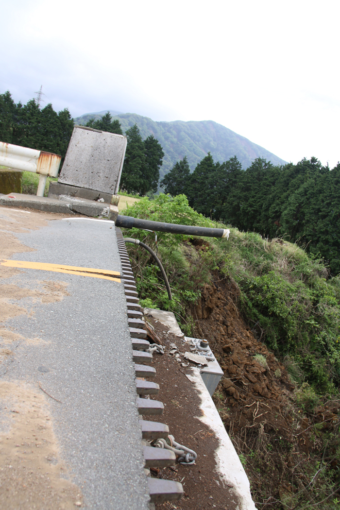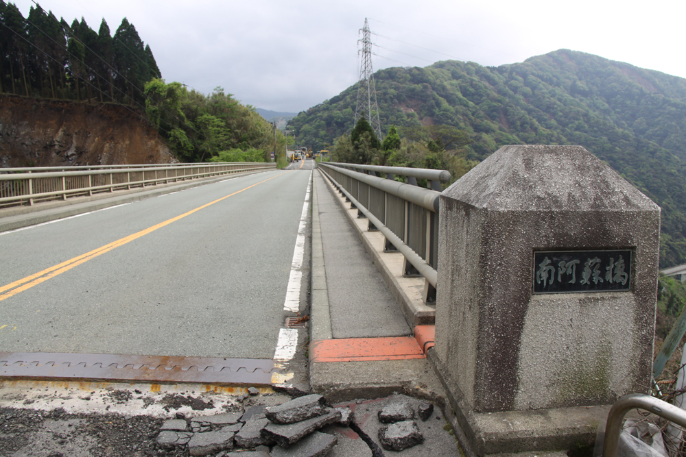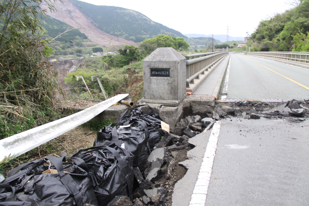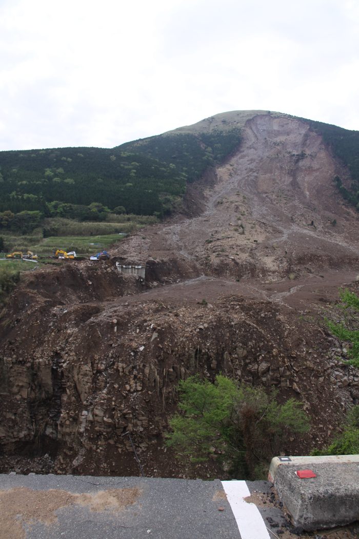 記者はそれを東側から見た。木戸川橋には損傷が見られないが、小山ホテルでは駐車場に止めてあった車が巨岩により潰されていた(後で付近に住む方に聞くと人は乗っていなかったようである。良かった)。さらに進むと倒木や転岩が方々にあり、道路は大きく地割れしている。白岩橋は橋本体には大きな損傷がなかったが転石が散っている。そして阿蘇長陽大橋のアプローチとなる戸下大橋は橋桁が一部で斜面崩壊に飲み込まれて落橋していた。