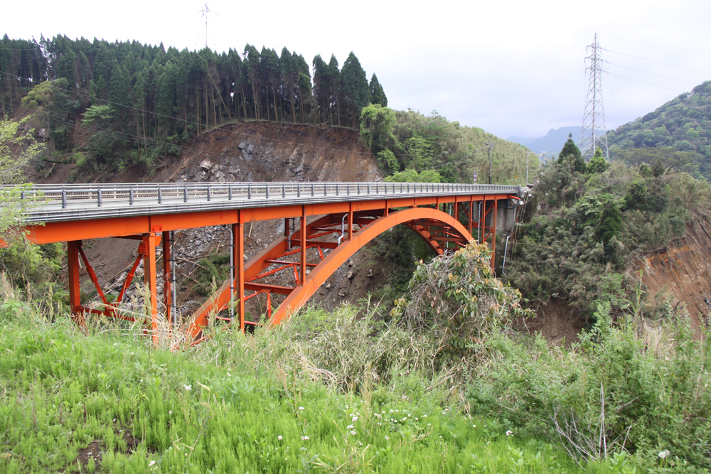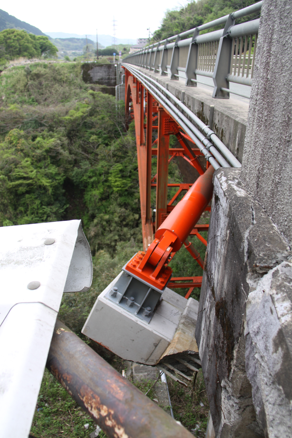 南阿蘇橋(橋長110㍍、総幅員9㍍、上路式2ヒンジ鋼アーチ橋)は、ジョイントの状況を見ると南側伸縮装置の損傷がより激しい。桁衝突時の影響であろうか、桁側が橋台に盛り上がるようなジョイントの状態になっている。また、片側のダンパーが根本からもげていた。地震時にダンパーが期待通り作動したのだろうか。同橋は制震ダンパーや座屈拘束ブレースなど制震装置を設置する一方で免震支承への交換はしていなかった。一方で北側橋台部の損傷はさほど酷くなかった。