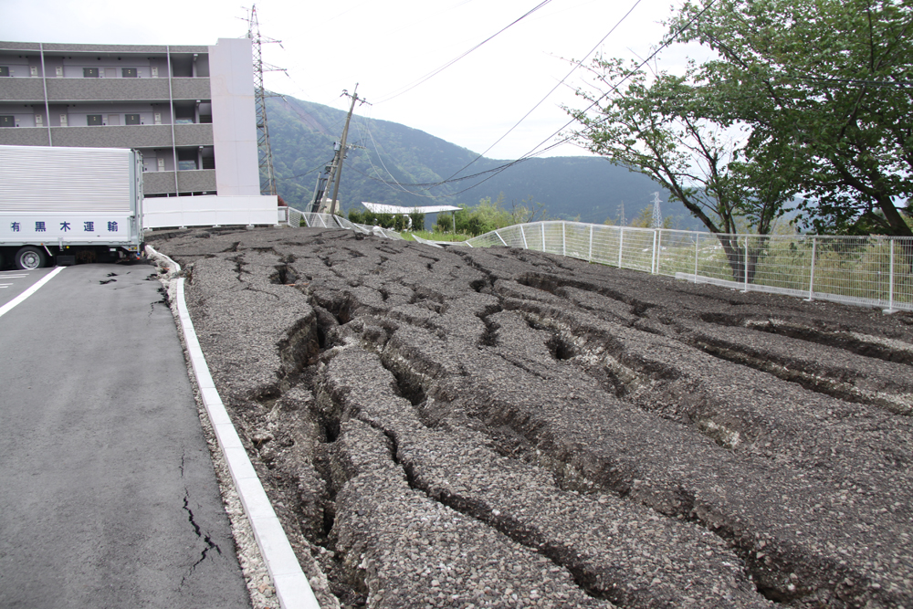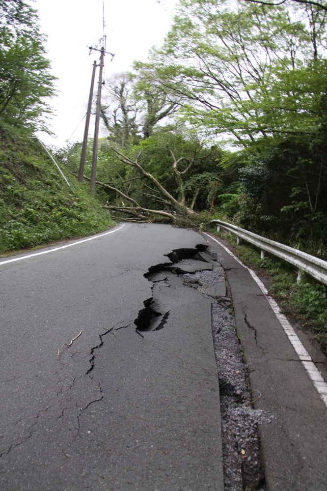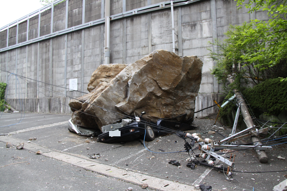 道路も大きなひび割れ、陥没を生じていた/巨岩が車を破壊していた