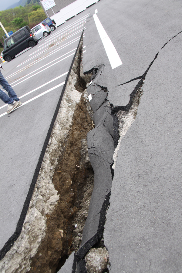 南阿蘇橋から阿蘇大橋への道すがら、ある駐車場を見ると、大きくひび割れが走り、目測であるが50㌢以上の陥没が見られた。国道57号と豊肥本線が走る対岸は大規模ながけ崩れが広範囲に生じている。