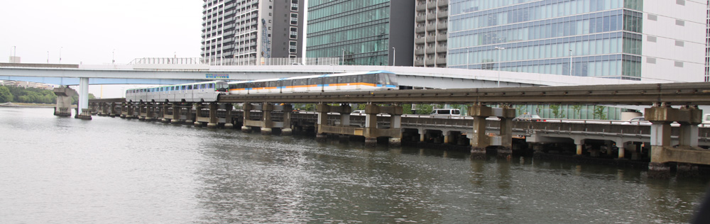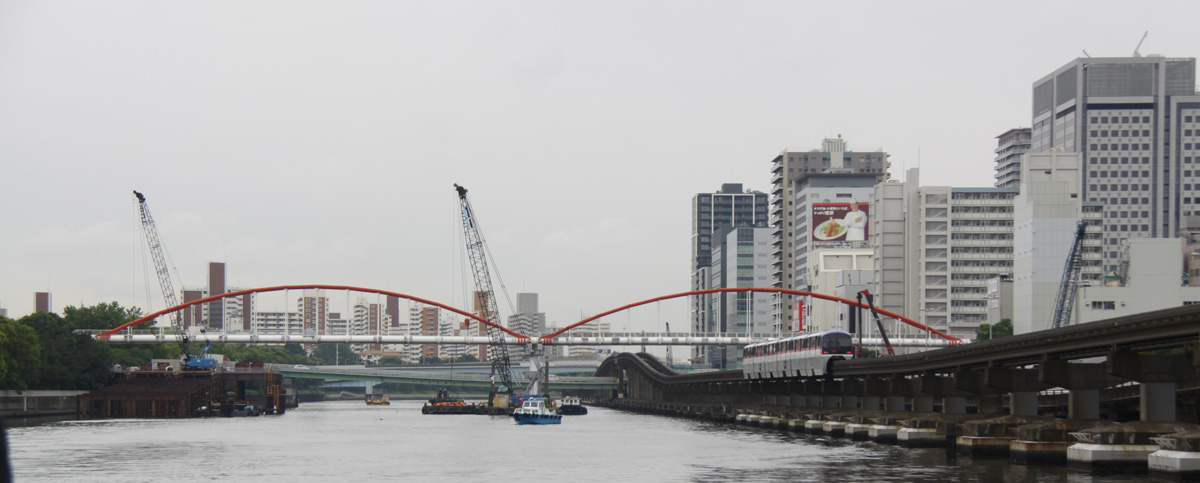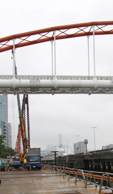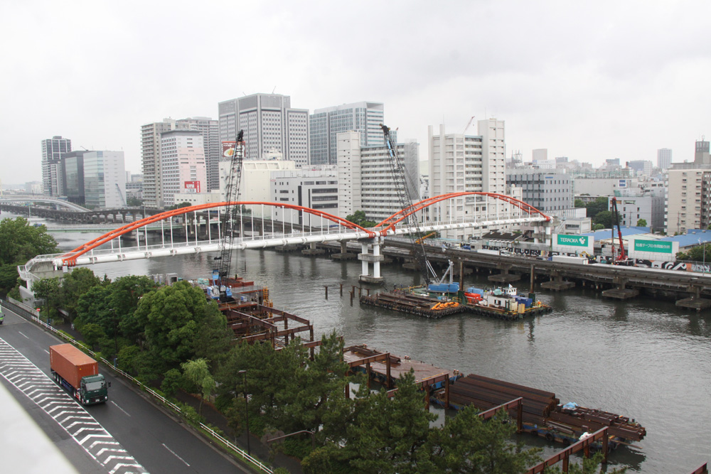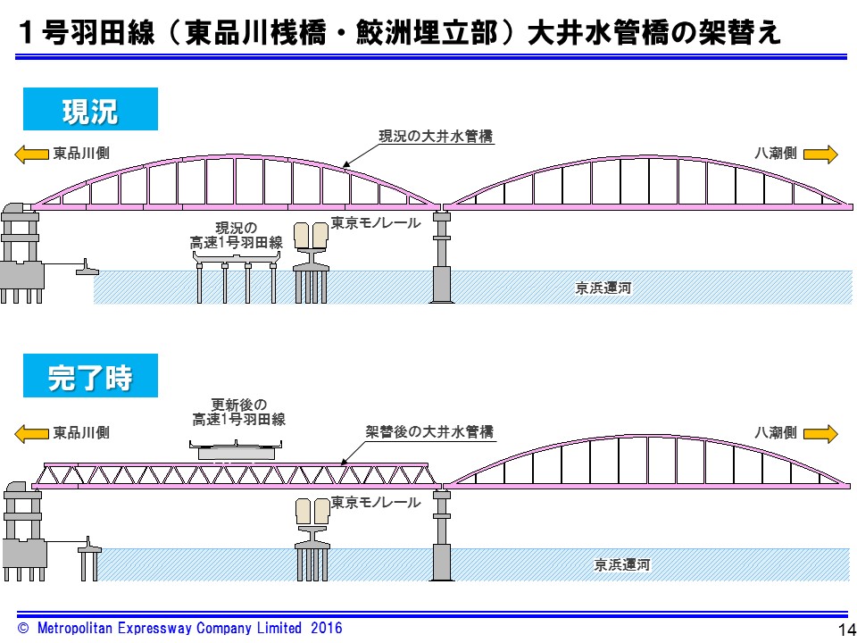 大井水管橋は現在、2径間の鋼ランガー補剛形式(79.8㍍×2)だが、更新後の高速1号の桁位置(水面からの桁下クリアランス20㍍程度の位置を通過する)から東品川側の桁の上弦材付近が干渉してしまうため、思い切って落とし、桁高の低い鋼トラス橋に架け替える。既に作業用桟橋工に着手しており、最終的には水管橋に沿って逆L字型の桟橋を運河上に構築するとともに東品川側の陸地にもベントを建て、それを用いて既設桁を6ブロック程度に小割にして撤去、新設桁は八潮側から横取り、縦取りして既設桁と平行になる箇所まで移動させ、き電停止後の僅かな時間を用いた夜間施工で横取り架設して完成させる。撤去・架設とも今秋の予定だ。