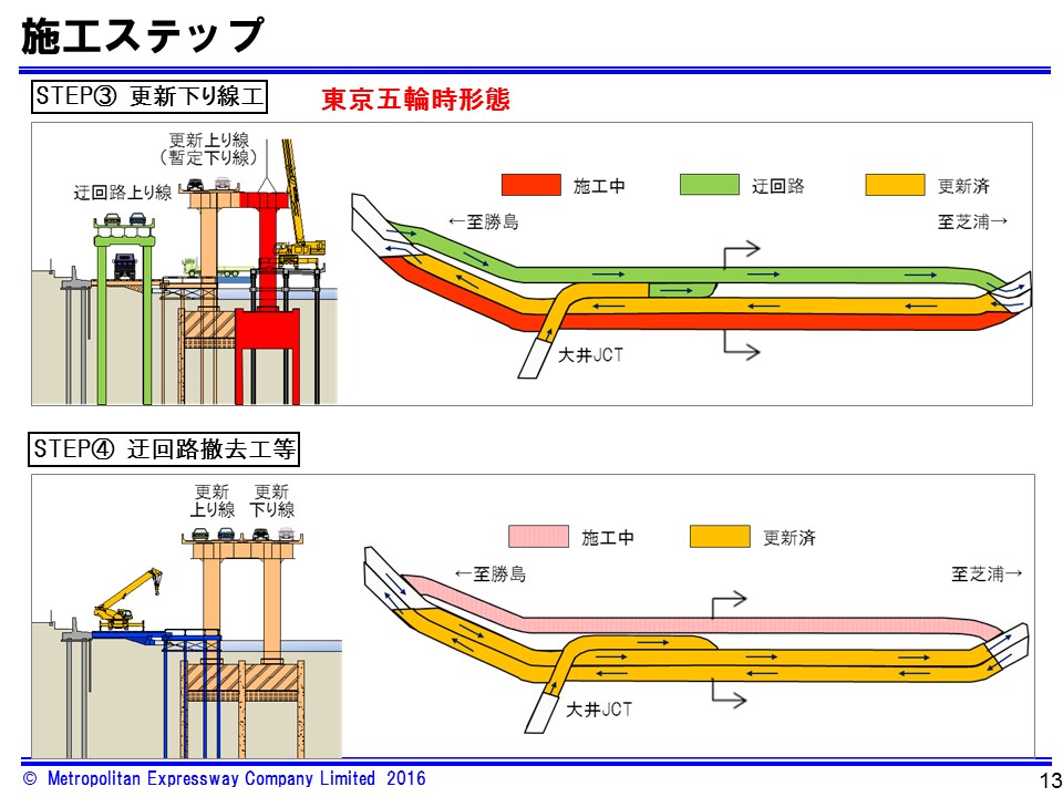 ステップ2は更新上り線の工事であり、平成32年夏までに完了させる予定。具体的には現道上り線の交通を迂回路に切りまわした後に行われる作業で、現道と桟橋との間の狭い空間(幅5㍍程度)に更新上り線を建設する。東京五輪は「ここまでのステップが完成し、既設道路上から更新線や迂回路に交通を全て移した状態で臨みたい」(同社)としている。