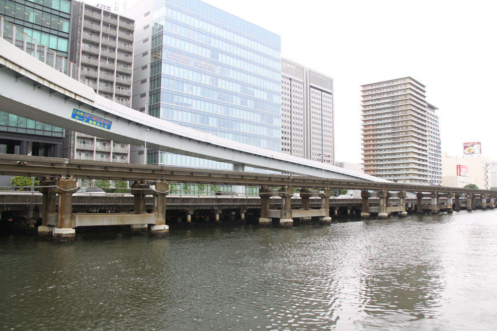 左側の運河内ラーメン橋脚の右側以降の桁50㍍と陸上部の橋脚を撤去する(井手迫瑞樹撮影)