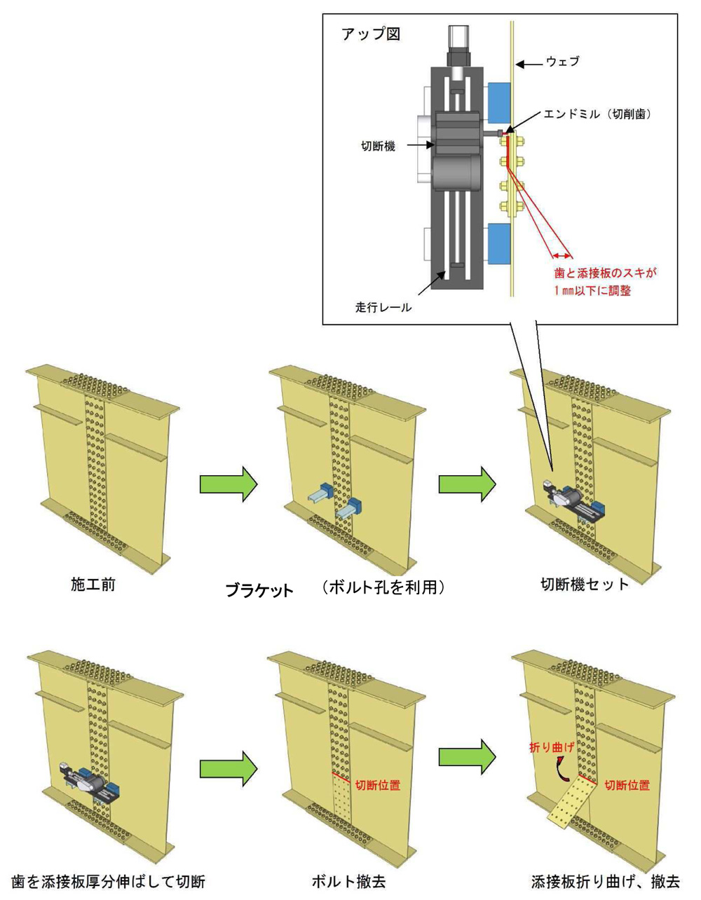 ウエブ面は下半分、上半分という順でボルト及び添接板を除去し、新たなものに取り替える。その際の添接板切断にはエンドミル(切断工具)を装備した特殊な切断機を開発して施工している。取り付けは切断機を取り付けるのに適当な箇所のボルトを先行で取り外してそのボルト孔を利用して、機械を取り付ける。設置の際、エンドミル先端とウエブとの間には隙間ゲージを利用して1㍉の隙間を設けてウエブに損傷を与えないようにしているのが特徴だ。そして当該添接板の切断位置までのボルトを切断した後は添接板を折り曲げて撤去する。これを繰り返す。上フランジ添接板に関しては床版コンクリートに添接板上面が埋め込まれており、取り替えることは出来ないため、ブラストした上で現場にてTAPS溶射を施工して防食している。なお溶射皮膜の厚みは基本的に100µm以上を設定し管理している。