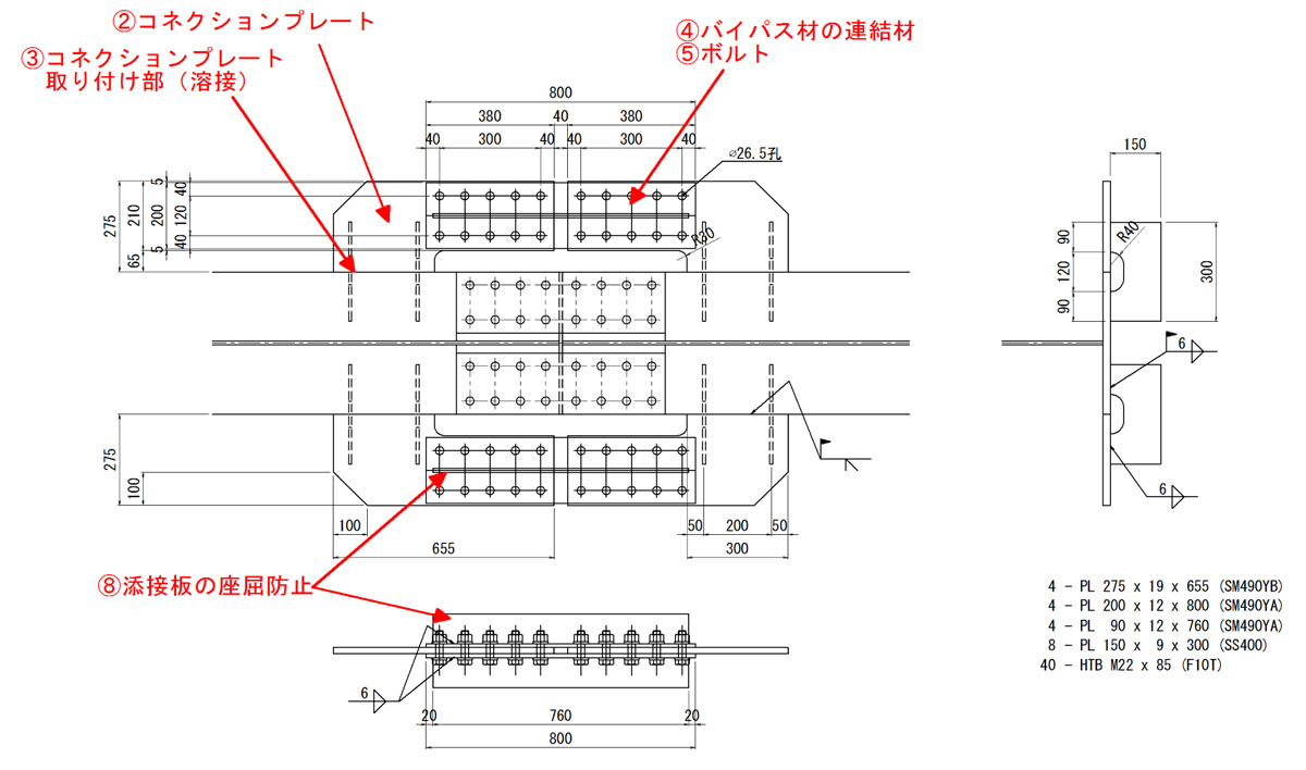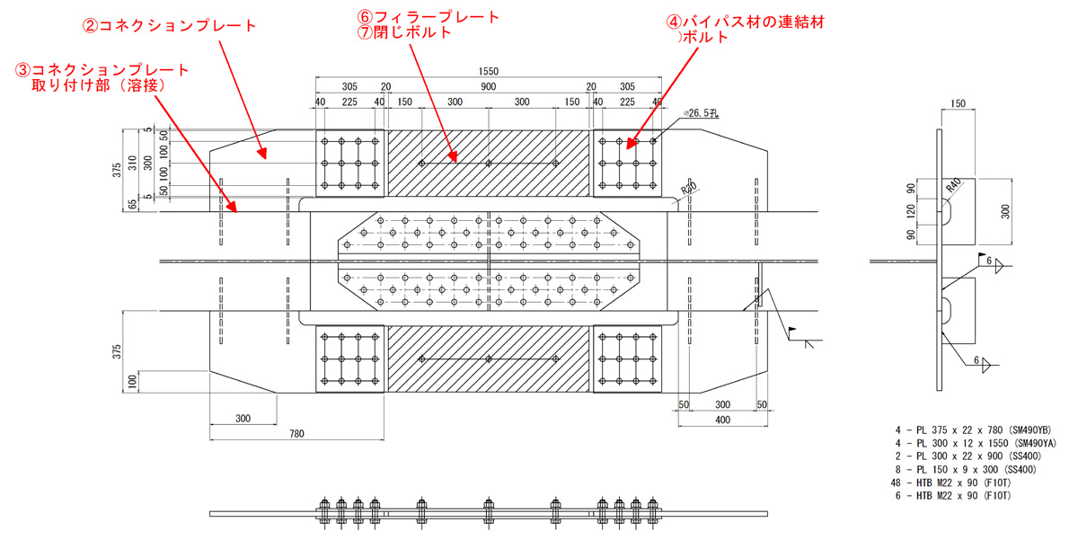 次に取替手順、工法である。構造上の安全を確保するために、箇所ごとの添接板を全部取り外すことは出来ないので、高さ方向に3分割して施工する。即ち1日目は(3分割した)1番下の部分を取り外して母材部分を溶射して新しい添接板の一部を取り付けて1日が終わる。それを中、上と3回繰り返す。ボルトの撤去から手順を踏まえて詳しく書くと、まず、下フランジの添接部を取り外すとその部分の耐力が不足するため、それを補強する一時的な補強部材(バイパスプレート)を設けてそちらに力を伝えるような構造を事前に造る。その際、圧縮がかかる箇所と引張りがかかる箇所で補強部材の形状を変える。具体的には長さを変えたり、リブを入れることで断面性能が良くなり座屈しないようにするなどの工夫を施している。