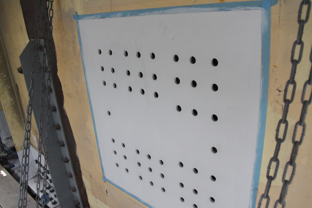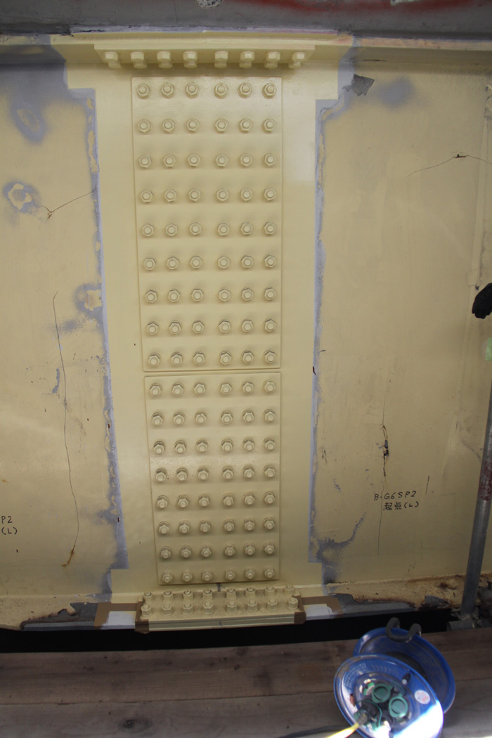 その上で、下フランジのボルトを外して母材をブラスト(試験により確実なアンカーパターンをつけるため投射材にはアルミナ製を使用している)してTAPS溶射を施し、添接板を溶射ボルトで復旧する。