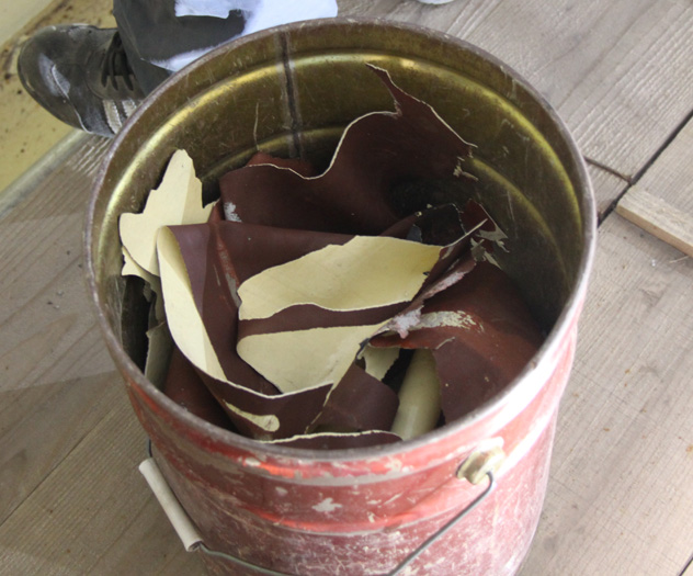 IH工法の施工(左、中)と掻き落とし(中写真奥)、除去された既設塗膜(右)