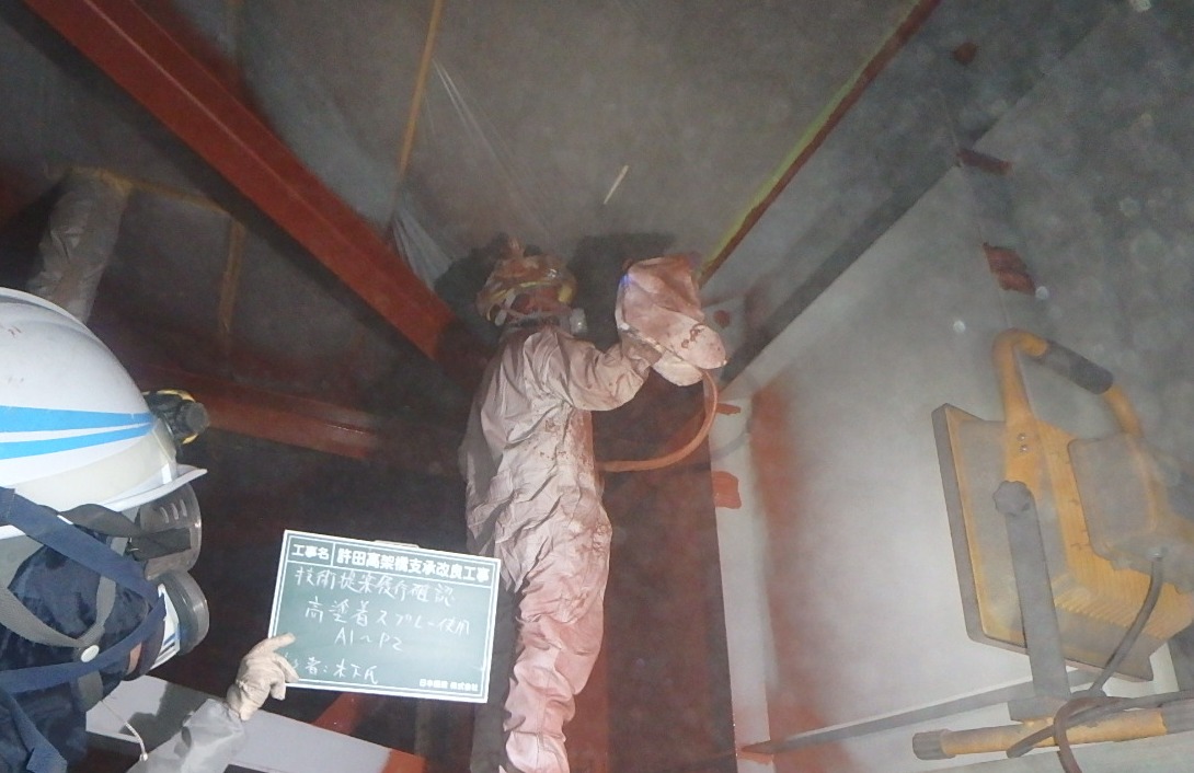 塗替え塗装工の面積は、約54,000平方㍍に及ぶ。既存塗膜成分中には調査の結果、鉛を含有しており、2014年5月30日に厚労省および国交省から出た「鉛等有害物を含有する塗料の剥離やかき落としにおける労働者の健康障害防止について」文書に従い、従来工法のままではブラストはできない。一方で、厳しい塩害により塗膜を何度も塗り重ねていることから既存塗膜の膜厚は一般部で1,200µm、特殊部で1,800µmという数値に達している。塗膜剥離剤も検討したが、「この膜厚では3~4回塗布しなければならずコストおよび工期的に難しい」(元請の日本橋梁)。そのためIH(電磁誘導加熱)を利用して既存塗膜を剥離するIH工法(ノルウェーRPR社製装置)を採用した。同工法は、西日本高速道路でも関門橋(北九州高速道路事務所管内)で採用事例があるなど実績を有しており、この厚膜でも「1度で全厚を剥離できる」(同)。許田高架橋ではRPR装置を6台(OSJBHD保有分5台、他にレンタル1台)投入している。装置一台当たりの1日施工量は20~25平方㍍であり、合計120~150平方㍍施工している。