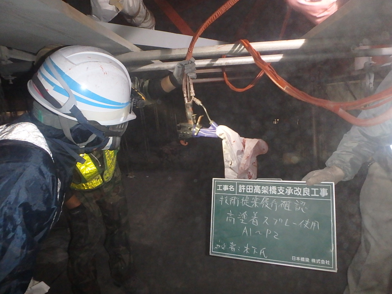 IH工法の採用に際しては、熱を加えて塗膜を剥がす工法であることから①鋼材の機械的性質の変化、②鋼部材の熱による歪み、③鋼桁(添接部)に施されたAl-Mg溶射皮膜の劣化、④高力ボルトの軸力低下、⑤付着塩分量の変化の5点について品質に問題が無いか試験施工により確認した。その結果、①についてはIHによる鋼部材の温度上昇は最大でも200℃以下であるため機械的変化の生じる650℃以上には到達しなかった、②熱による歪みはウエブで最大8㍉程度発生したが、鋼材温度が降下すると0~1㍉程度に収まり、問題となる歪みは発生しなかった、③同様に熱による溶射皮膜への影響もなく(封孔処理は300℃程度で変色するが温度上昇は先述のように200℃以下)、④軸力低下も見られなかった、⑤付着塩分量については、IH施工前は124mg/平方㍍が7mg/平方㍍に大きく低下しており、除去した塗膜と一緒に落ちていると考えられることから水洗いの必要もないという結果が示され、使用に問題はないことが確認された。