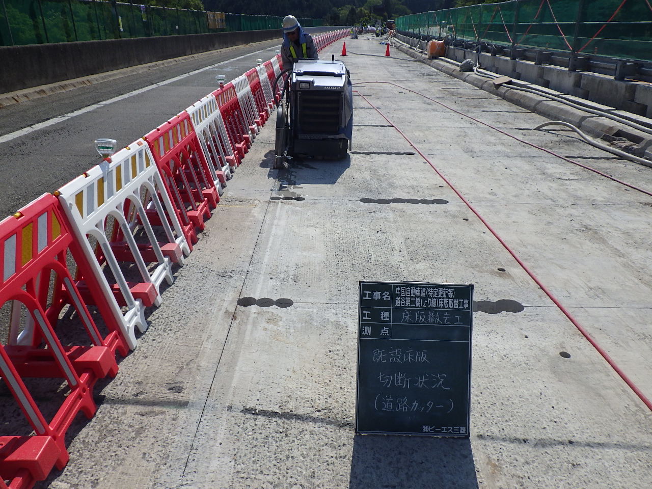 桁下には市道(山口市道安養地上角線)があるがクリアランスは約25㍍ある。桁下に足場を設置しているがこれは全て橋梁点検車を利用して構築した。下段と中段に分かれており、両足場とも全面板張り防護の上、下段足場はコンクリート殻が下に落ちないようにネット養生も設置している。また、床版切断はコア削孔機とコンクリートカッターを使用した。