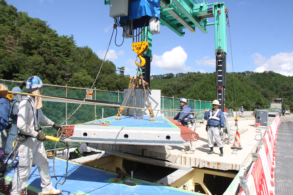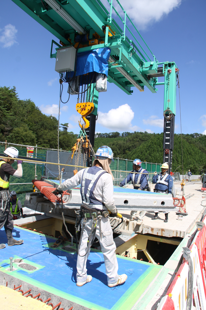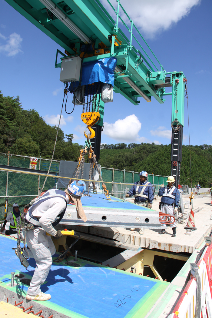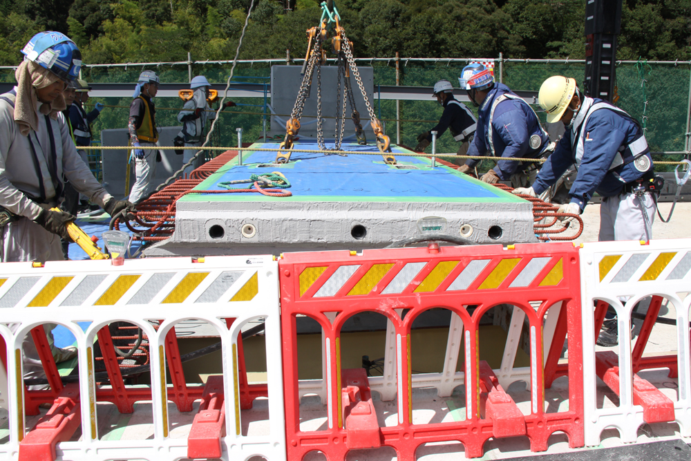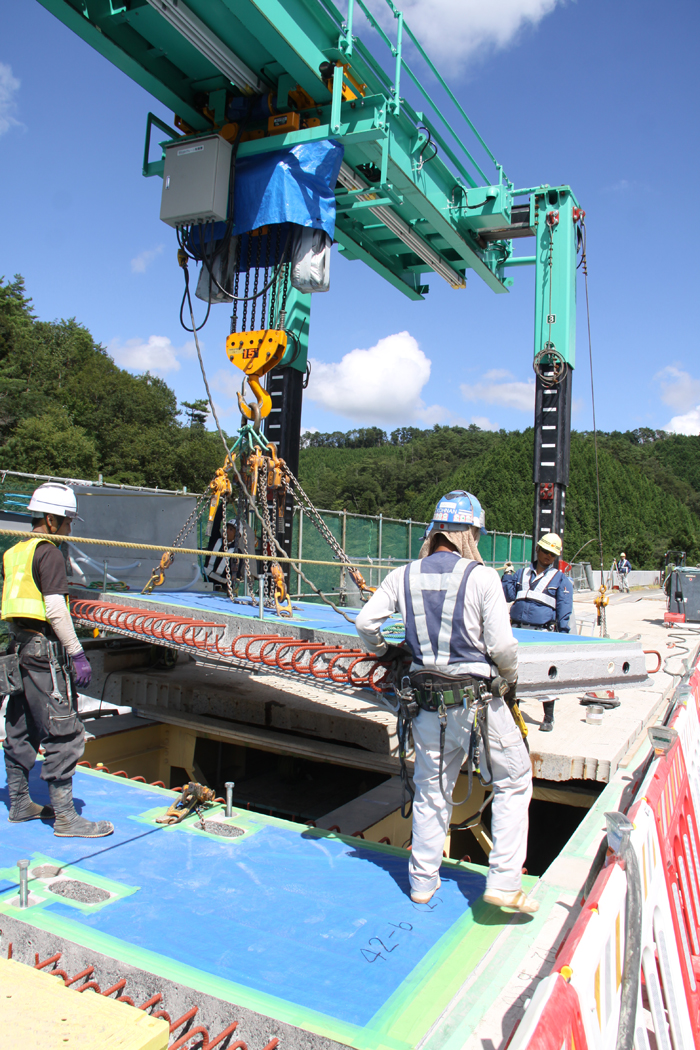 新しいPCaPC床版パネルの1枚当たり重量は、1次施工分で2×5㍍約7㌧、2次施工分で約8㌧。2次施工分の重量が増えているのは、床版ハンチや壁高欄形状の違いによるためである。