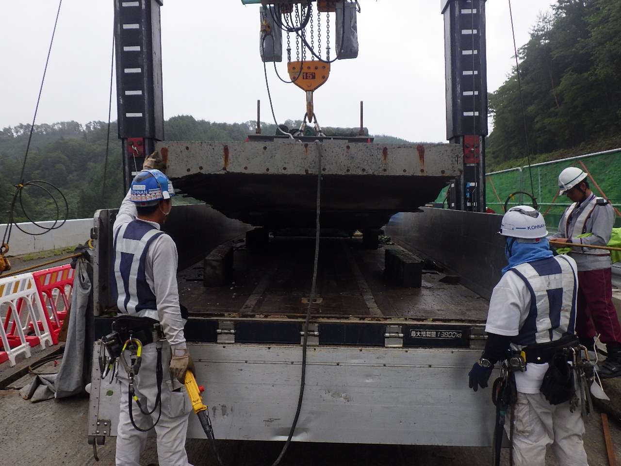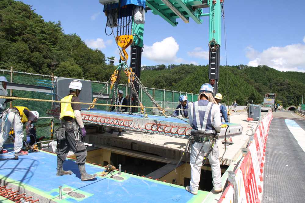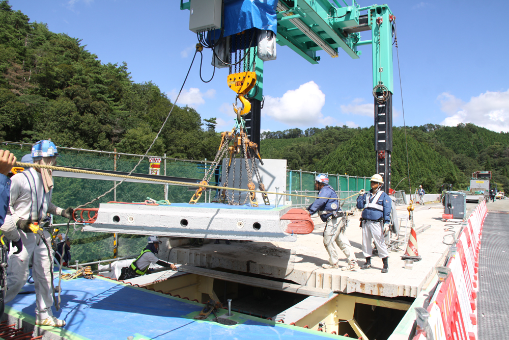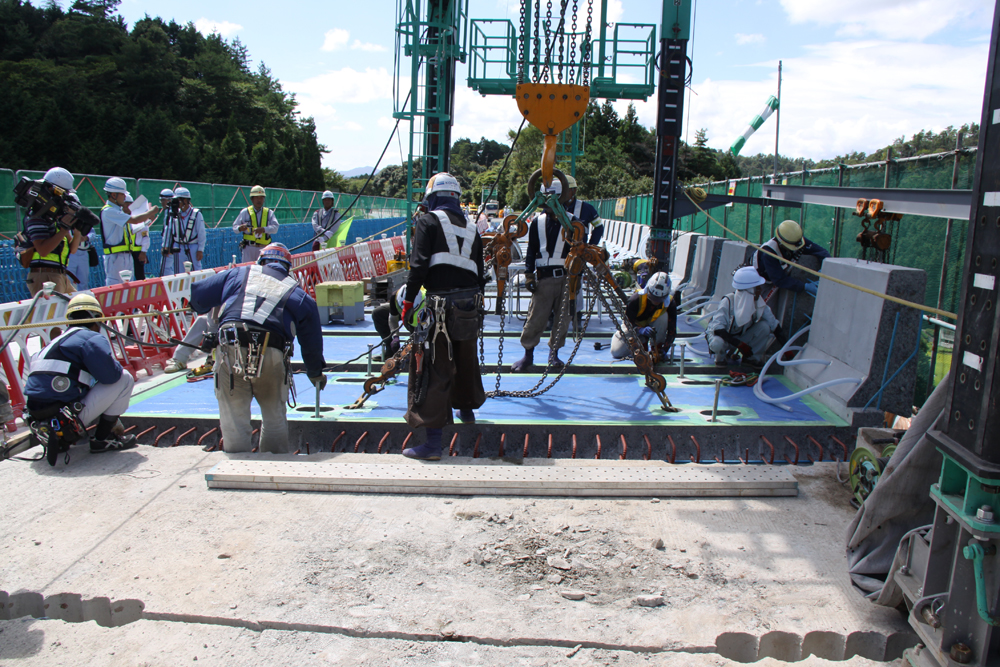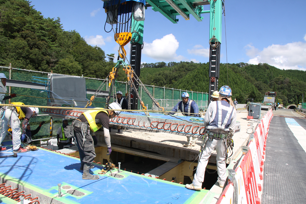 新しいPCaPC床版パネルの1枚当たり重量は、1次施工分で2×5㍍約7㌧、2次施工分で約8㌧。2次施工分の重量が増えているのは、床版ハンチや壁高欄形状の違いによるためである。