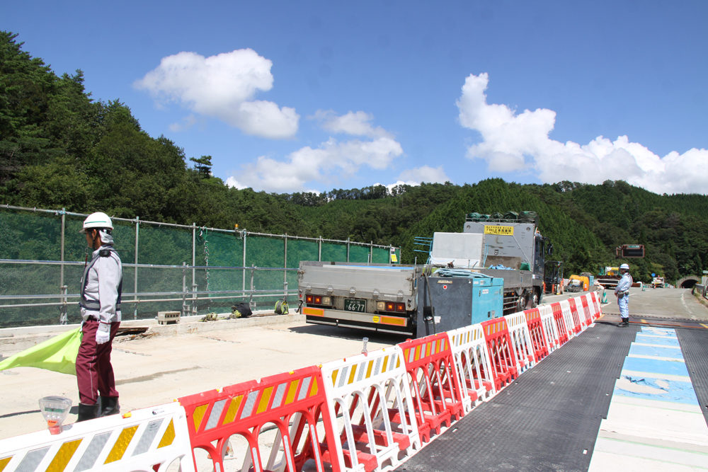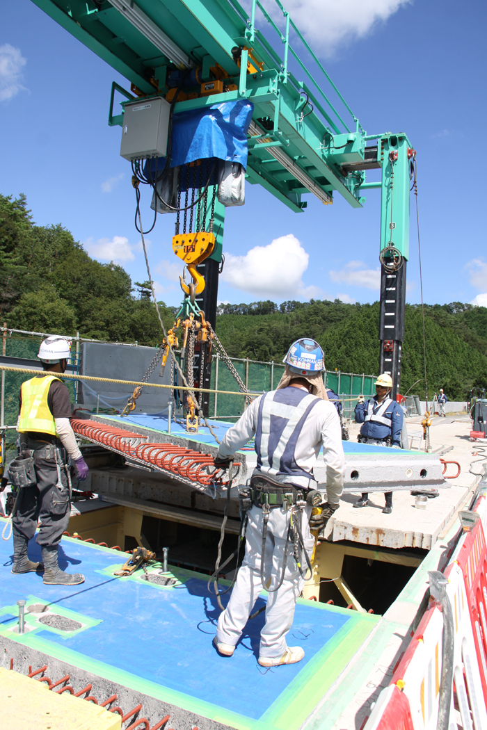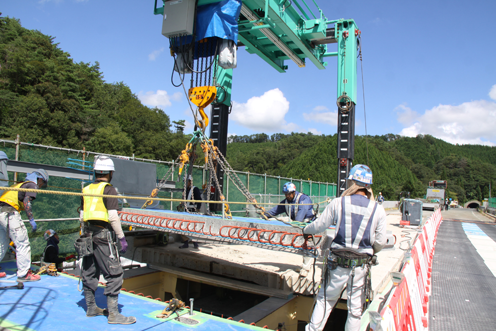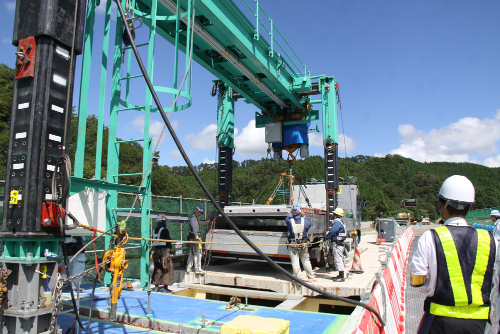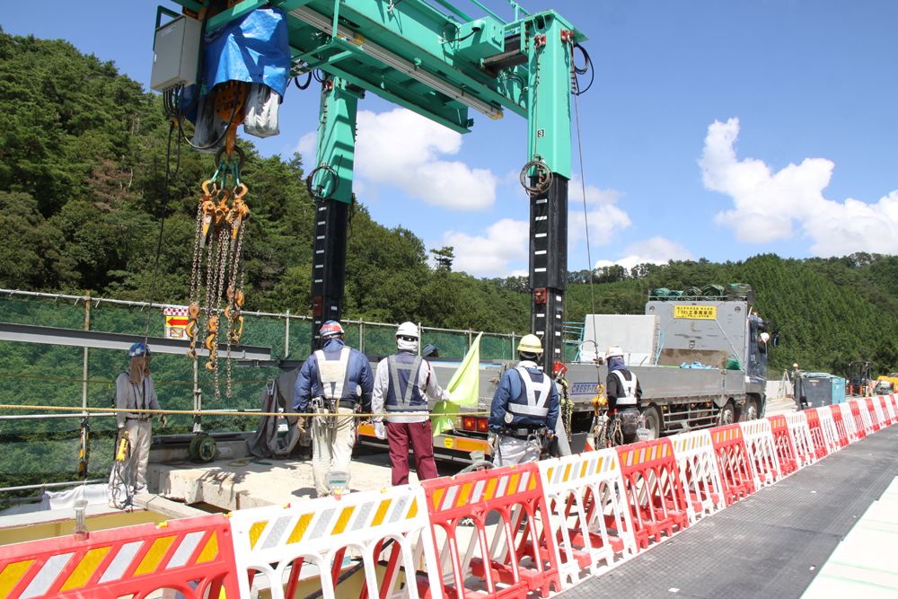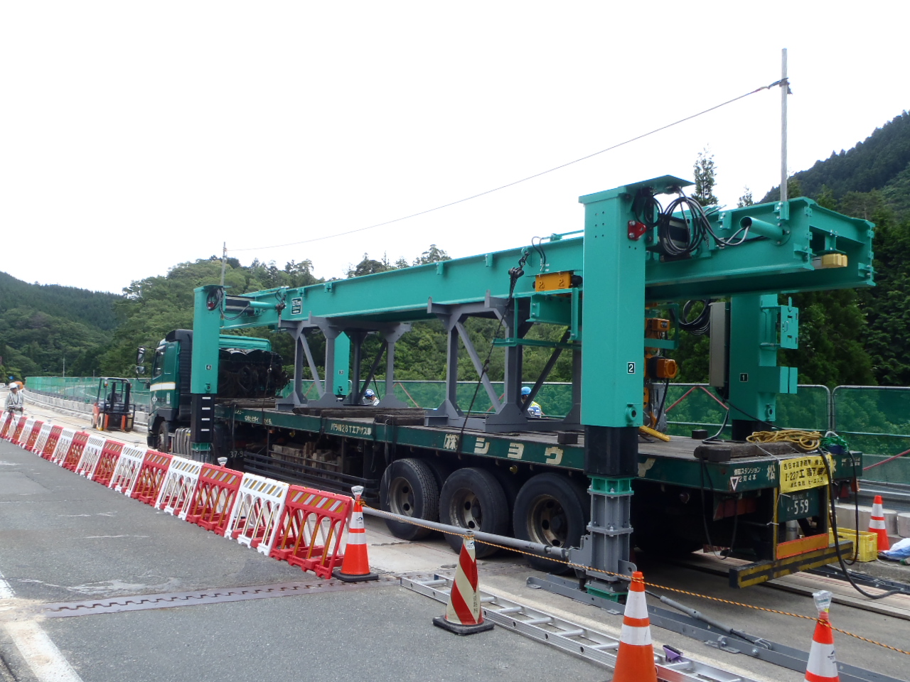 この施工において斬新な点の一つは、施工車線内のみで組立および運用可能な架設(撤去)装置の採用である。同装置は、橋軸方向10㍍、直角方向4㍍まで対応可能な門型形状の架設装置。同装置はトレーラーで運ぶことができ、荷降ろし後は4本の足が油圧で自動勾配調整できるようになっている。