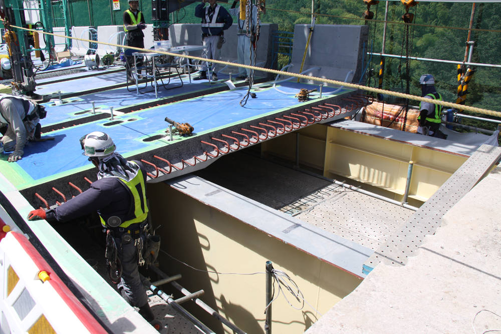 施工は、既設床版(1枚当たり橋軸2×直角5.5㍍、約6㌧)を切断した後、門型架設装置を用いて切断した床版を吊上げ、門内に進入させたトラックの荷台に上に下ろして搬出する。既設床版を引き剥がした後のフランジ上面は多少劣化が進んでいるため、主桁上面をケレンして有機ジンクリッチペイントで防錆処理し、架設前に基準となる墨出しを行う。次いで新しい床版パネルを載せたトラックが門内に進入し、荷台から吊り上げて、慎重に測量しながら桁上に床版パネルを配置していた。床版パネルは、吊り装置で縦横断の勾配をある程度調整しながら、静かに所定の位置に落とし込む。トラックの荷台から吊っていくため当初はパネルの長手方向が橋軸直角方向になっており、パネルを旋回させながらはめ込んでいく必要がある。パネルは、この旋回時に車線幅外へはみ出さないように設計しているが、施工も気をつけながら行う。ある程度位置決めした後はレバーブロックで微調整しながらパネルを配置し、最終的には測量で確認する。こうした手順を繰り返すことにより1日3枚のパネル撤去・架設を実現している。