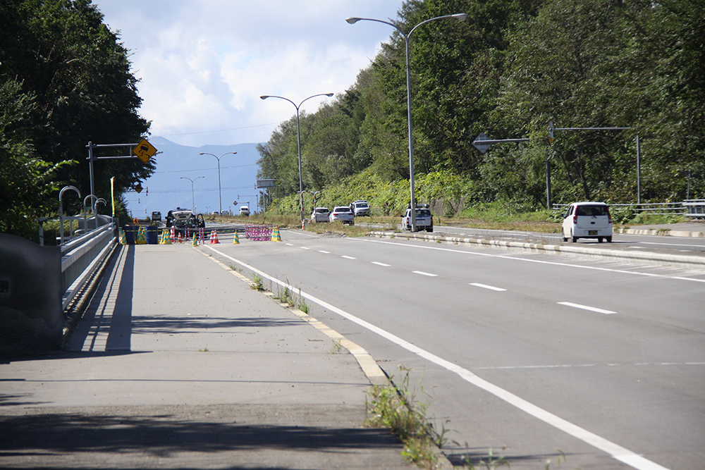 今回の取材で最後に行ったのが、国道38号の小林橋だ。小林橋は国道38号と道東道が交差する箇所のほんの僅か北側、小林側の渡河部に架かる橋梁。残念ながら立ち入って見ることはできなかったが、遠目から見ても桁が落ちているであろうことは分かった。北海道開発局によると下部工の一部が洗掘により倒壊し、桁が一部落下しているとのことである。国が管理する道路で被災したのは国道38号で4橋、国道274号(日勝峠)で10橋である。38号の4橋は取材した小林橋(十勝清水町)、芽室橋(芽室町)、太平橋(南富良野町)のほかにペケレベツ川渡河部にある清見橋(十勝清水町)で橋台背面盛土が流失しているとのことである。芽室橋は4車線道路を一部区間暫定2車線にすることで対応している。清見橋は仮橋の設置工事を進めている。