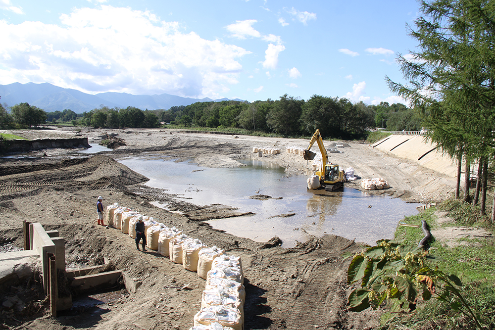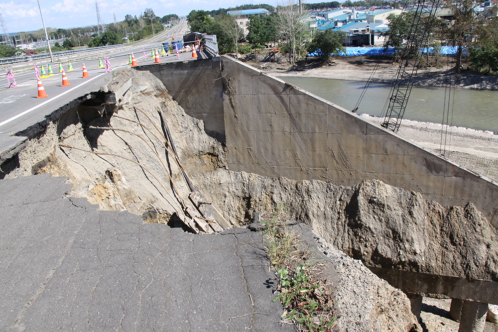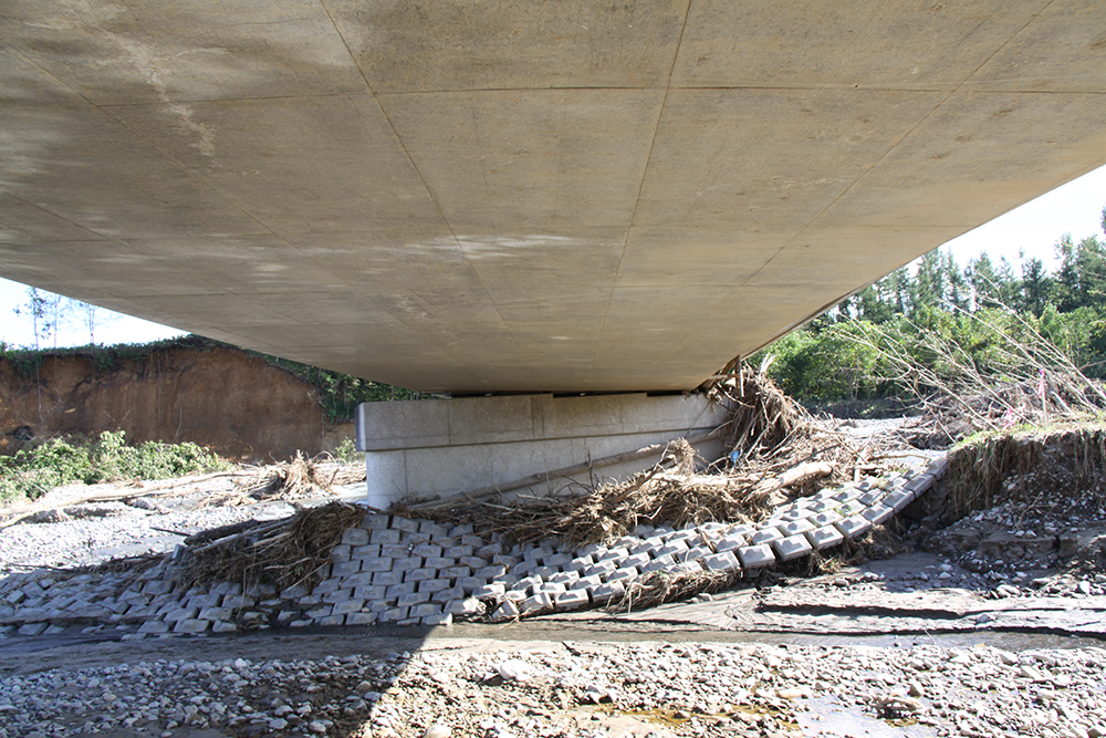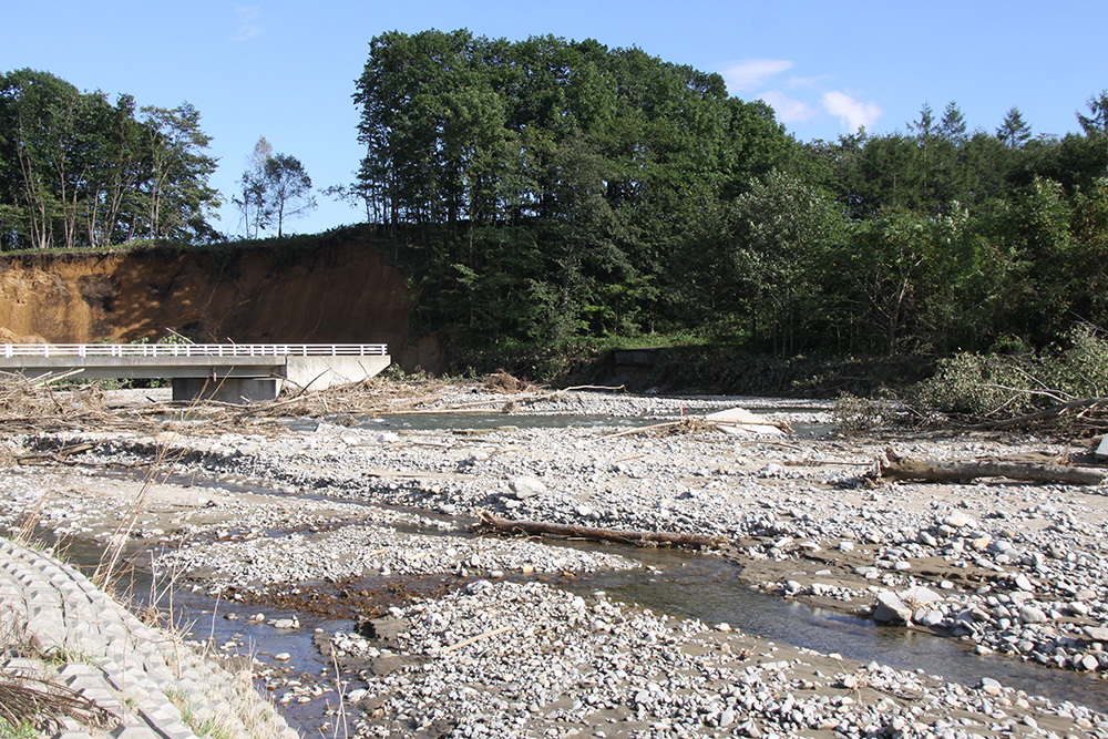 芽室橋は4車線のうち2車線を止め対面通行で供用していた/大きく被害を受けた付近の河岸