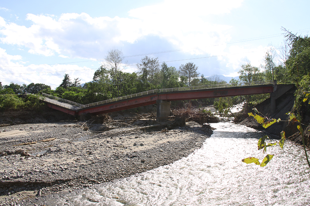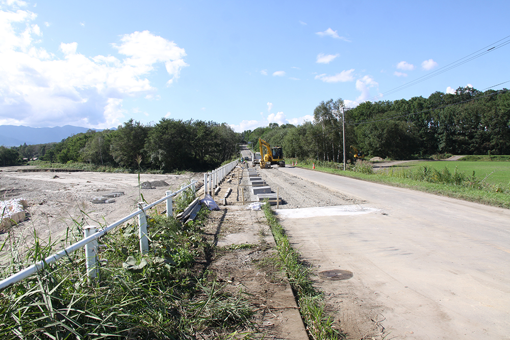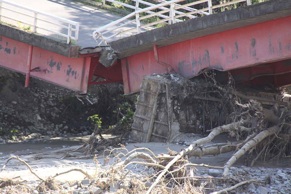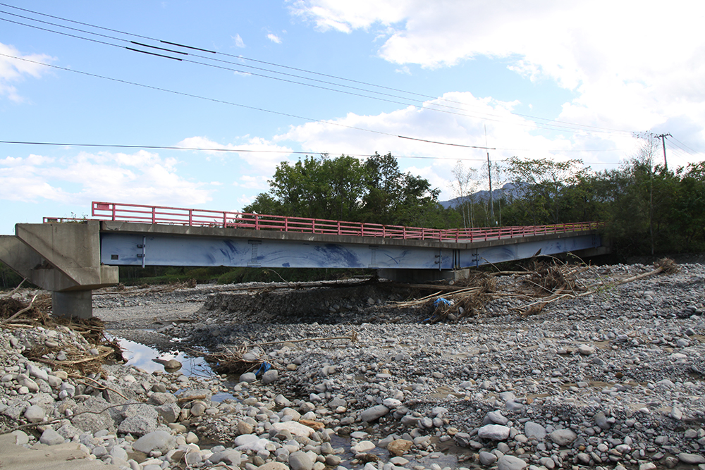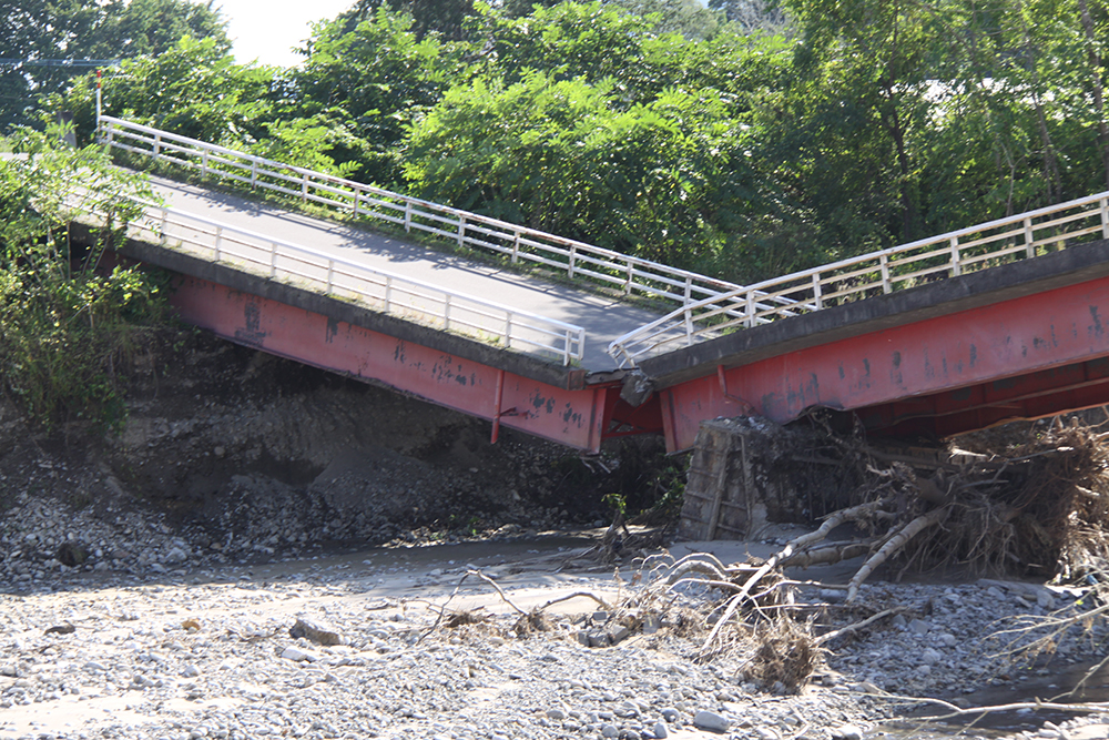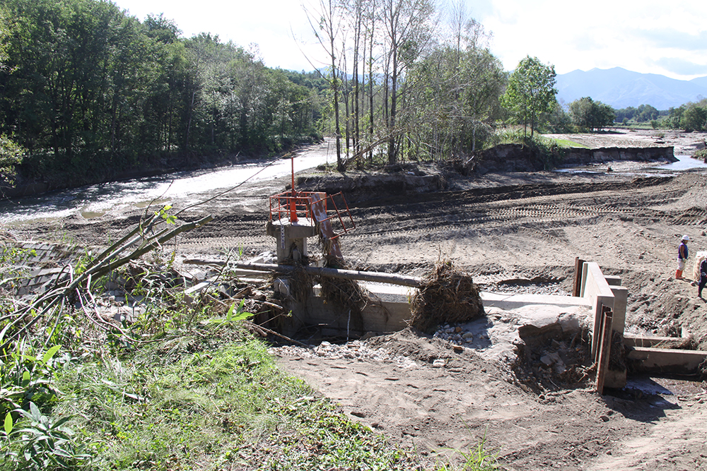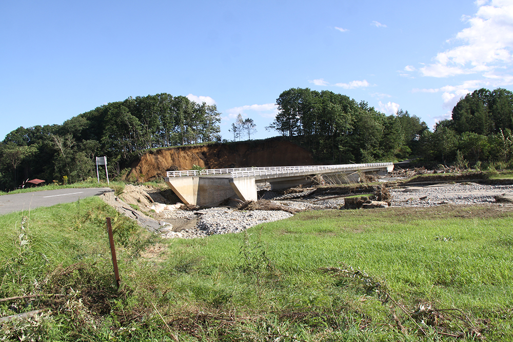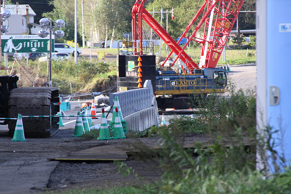 次いでその上流にある日進橋は確認できなかった。後で芽室町に聞くと流失したとのこと。美生川に架かる西伏見橋も流失した。また、久山川に架かる北海道道55号の報徳橋は橋そのものは持っていたが、久山川そのものが大きく氾濫し、同橋近くの盛土を大きく損傷させていた。記者が訪れた時にはほぼ復旧工事を終えていたが、道の脇を見ると洪水の爪痕が大きく、そこに何があったか分からない状態だ。おそらく農地であったのだろうが……。さらに近くの芽室川上流に架かる上芽室橋は3径間の鋼鈑桁だが、橋脚が1基完全に倒壊し、もう1基も傾斜していた。また、片方の橋台も大きく損傷しており、桁が2径間分落ちていた。同橋については仮橋での復旧をかける方針。西芽室橋は当面通行止めで、流失した2橋については「めどが立たない状況」(芽室町)としている。