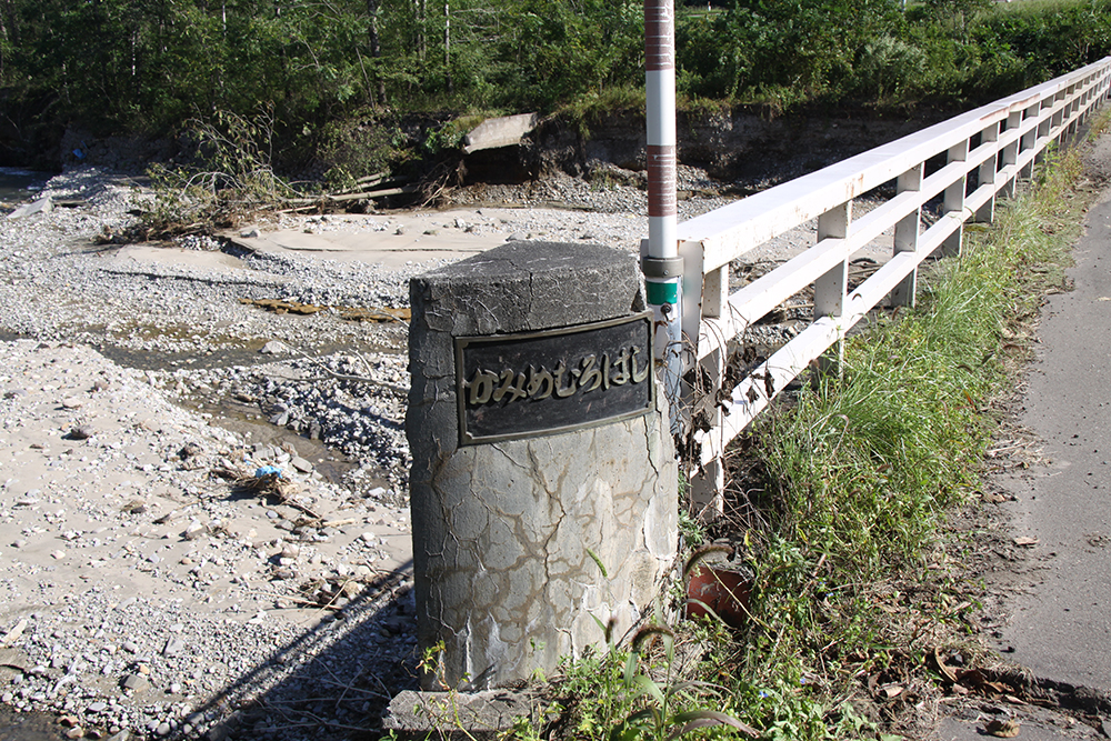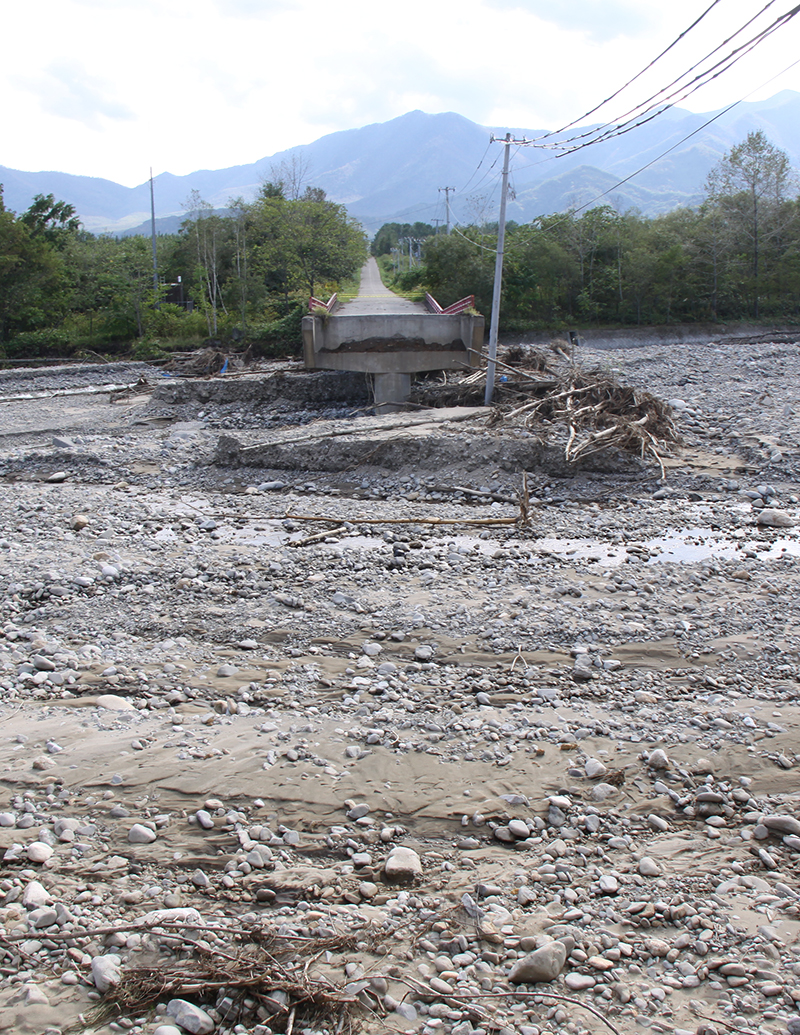 芽室川をさらに上流へ遡り十勝清水町内に入り、昭和あたりで立派なPC2径間連続桁を見つけた。千歳橋である。しかし、ここもカルバート化していた。橋脚、橋台、桁は無事だが、橋梁上下流の護岸と同じくアプローチ部が完全になくなっている。片方の橋台に至っては、背後の斜面がかなりの高さまで削られている。そこまで水が到達したのか、下部が大きく抉られ上部が崩落したのか、メカニズムは推定できないが、いずれにしても大きな力が働いたことだけは分かる。十勝清水町はこうしたアプローチ部の損傷を被った橋梁が、同橋、前日取材した石山橋を含めて21橋ある。