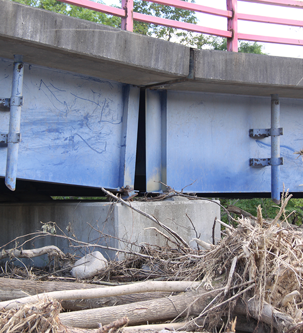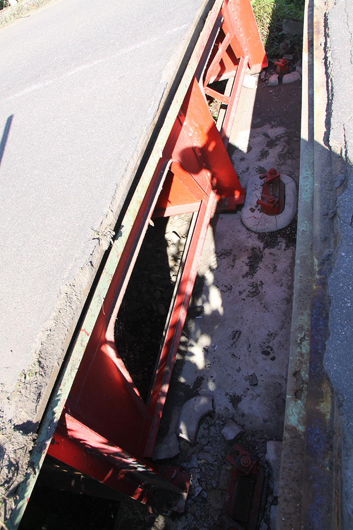 橋脚部の支承損壊/桁は1972年に架設されたようだ/側面から撮影した上芽室橋の損傷状況