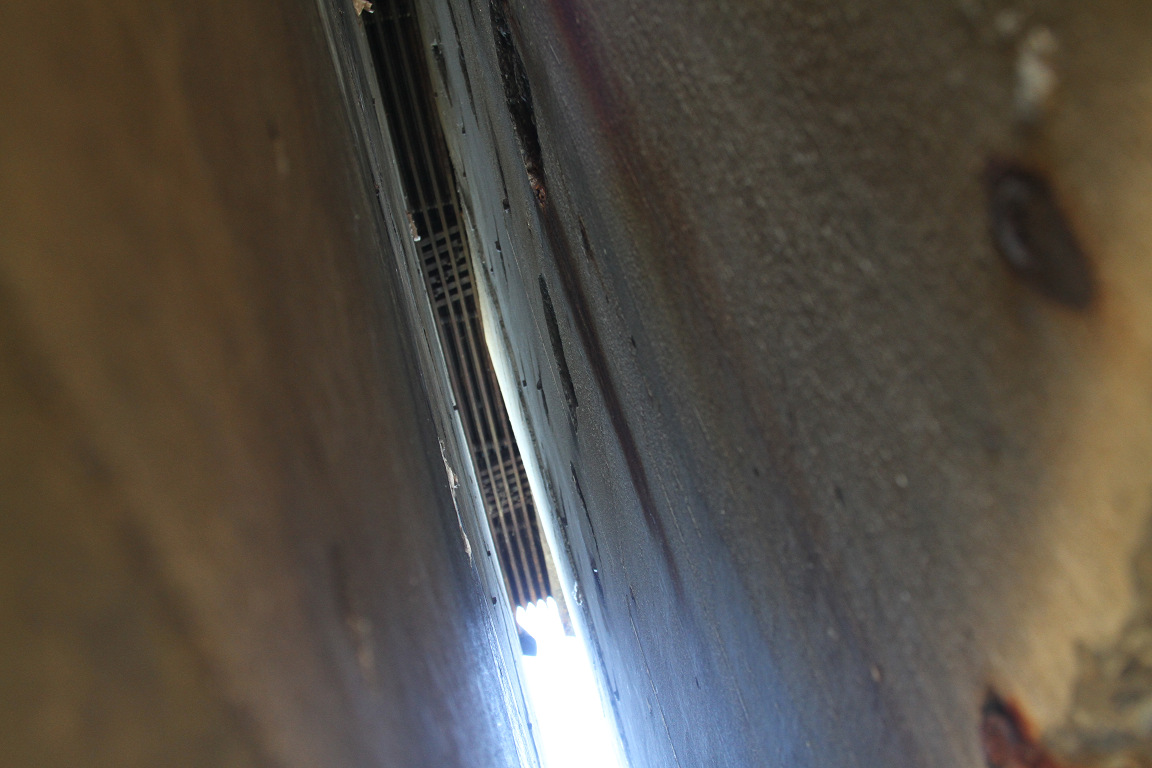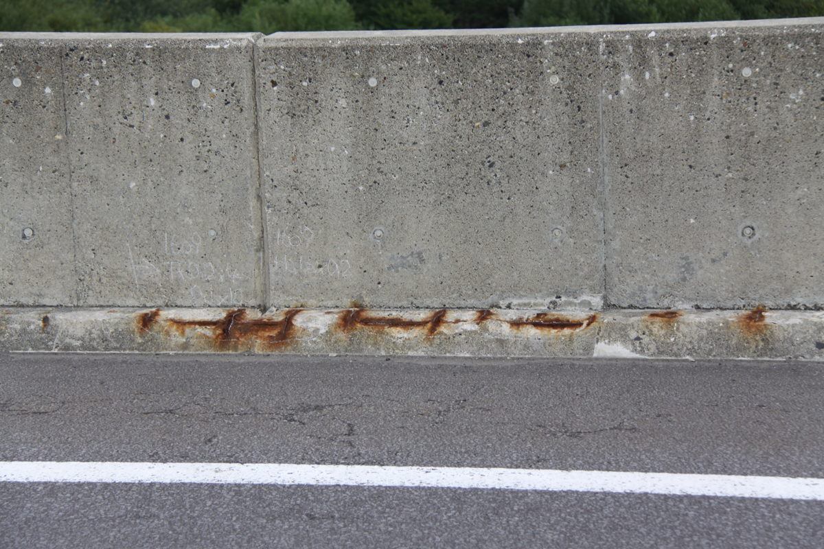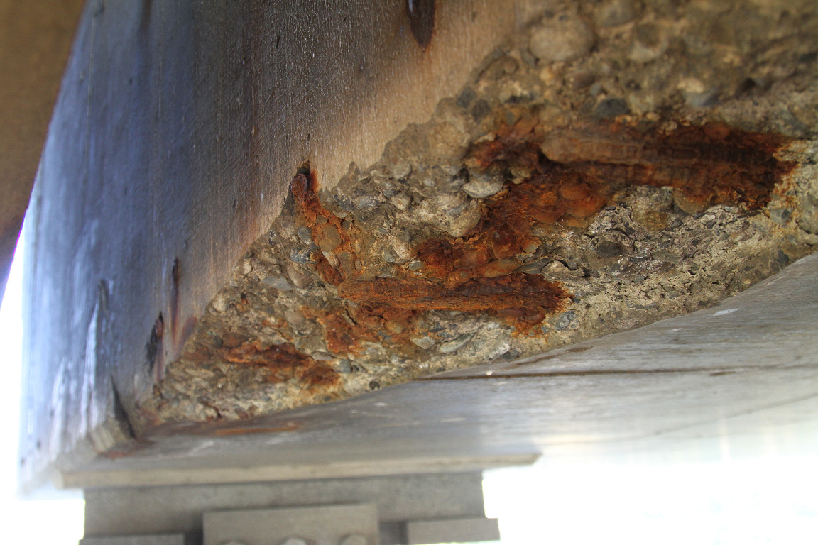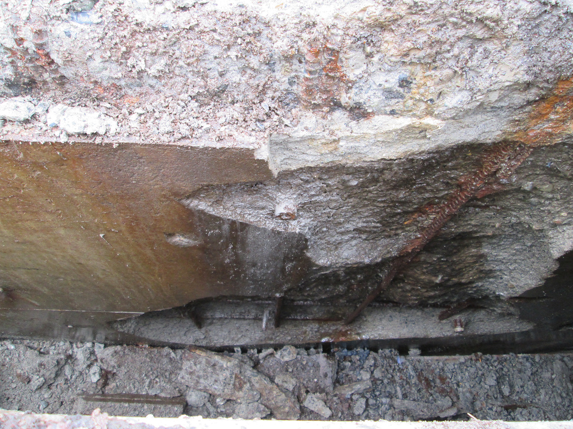 桁端部の塩害を結果的に助長した中央線部のカッター排水溝。同部分そのものの劣化も目立つ