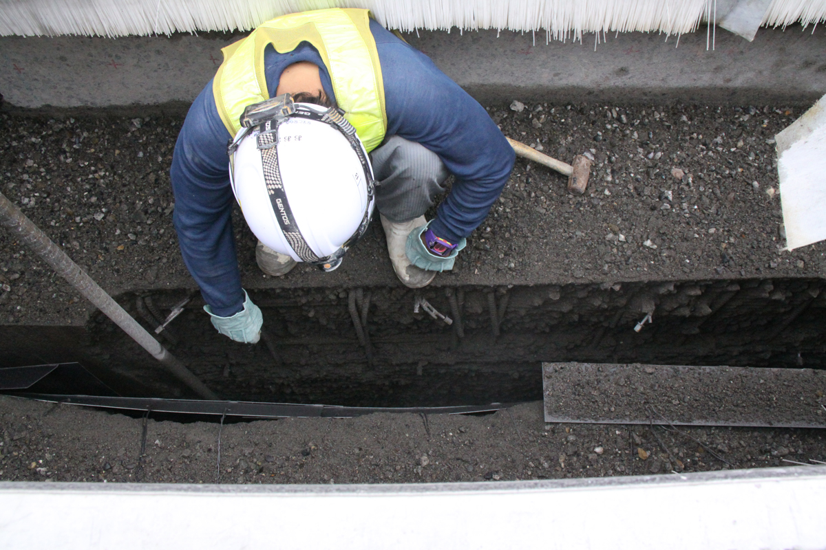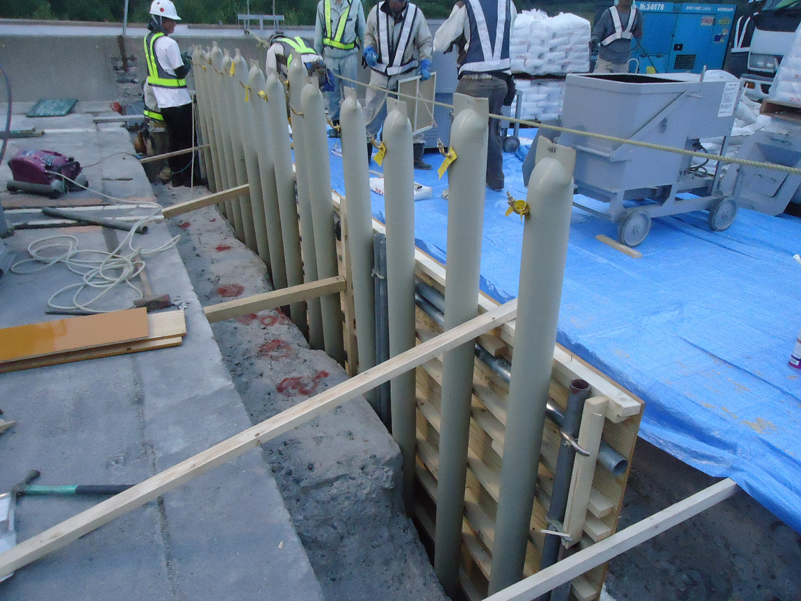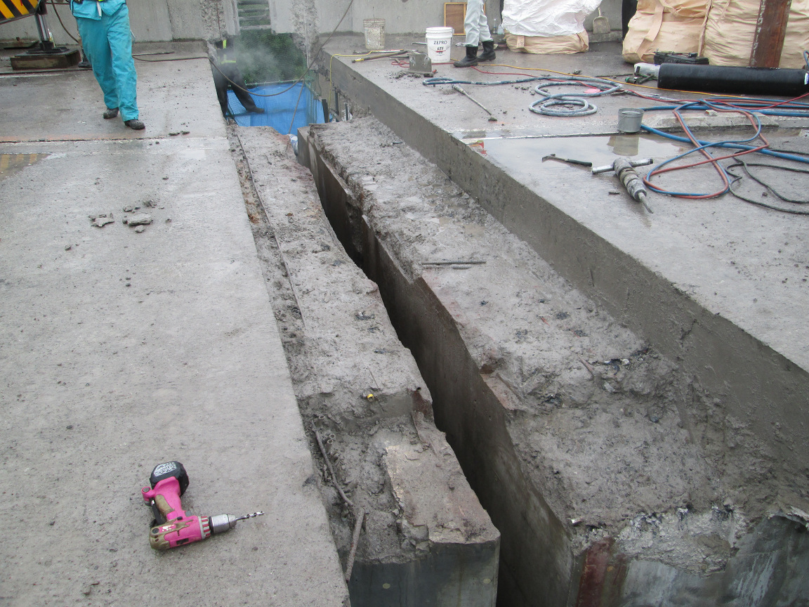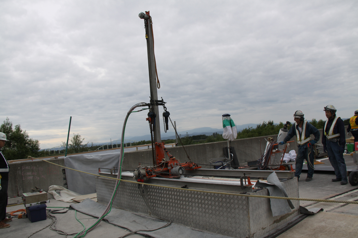 損傷点検および測定の結果、P8を除く桁端部は、塩害が桁断面のうち上面部分に集中しており、はつり面積はそれほど多くない。しかしP8は前述のような塩化物イオン量が桁端部全面に渡って存在したことから桁断面全高(3,500㍉)×全幅(6,700㍉)を80㍉深さ(かぶり厚+鉄筋裏10㍉)はつることにした。「これほどの桁高をWJではつるのは例がない」(ショーボンド建設)。現場では12時からはつり工事を開始し、途中(はつり不要箇所を防護する)鉄板が外れるなどのアクシデントもあったが、昼夜兼行で作業し、予定の24時間以内にはつりを終えることができた。