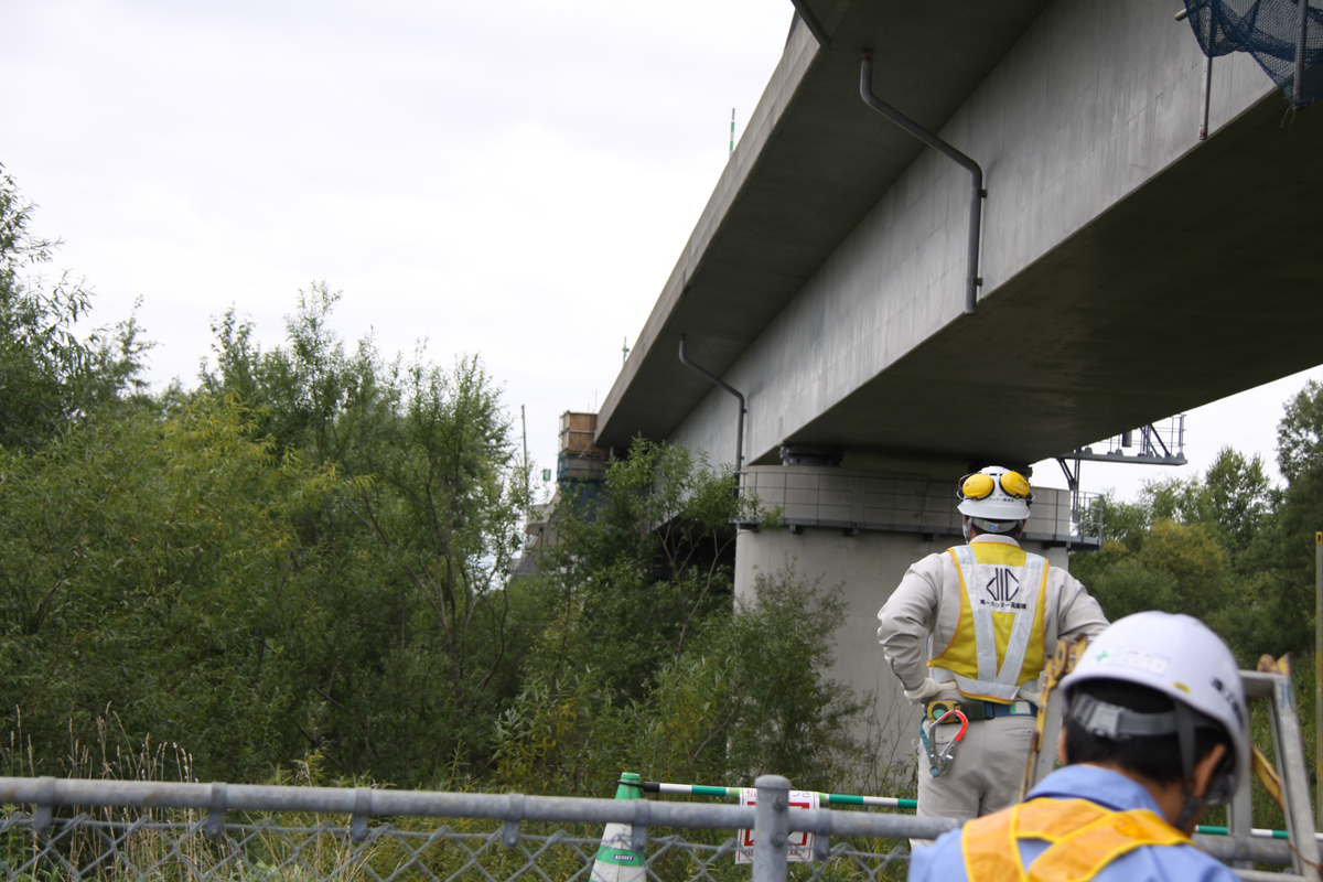 東日本高速道路北海道支社は、深川・留萌自動車道の深川大橋における桁端部の補修を進めている。同橋は平成10年4月に供用された連続PC橋。供用15年を過ぎた平成25年度に、伸縮装置(機械式伸縮継手)の部材が破断する損傷が生じたため、該当部を鋼製フィンガージョイントに交換している。今回は、同様の伸縮装置を撤去し、鋼製フィンガージョイントに取り替えるとともに、伸縮装置の止水機能低下に伴う漏水により損傷している桁端部の補修を行うものである。特にP8については遊間幅の狭い中で、A1側の桁高(3,500㍉)全ての断面を80㍉はつり、塩分吸着剤混入型ポリマーセメントモルタルで断面修復する。(井手迫瑞樹)
