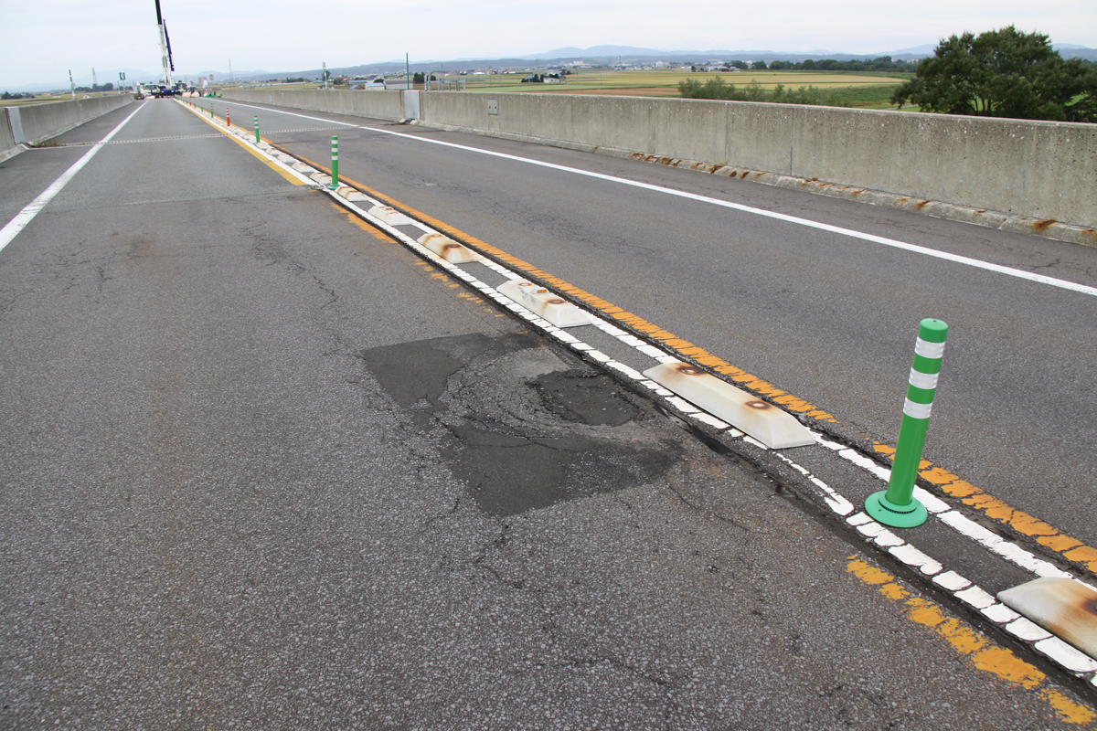 損傷原因はジョイントの損傷、止水性能の喪失に加え、積雪寒冷地における暫定2車線特有の排水構造がある。