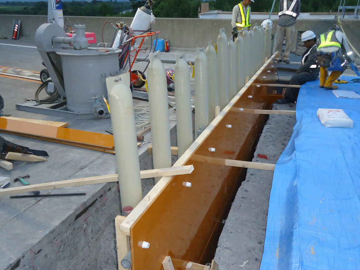 WJによるはつりが完了した後は断面修復材打設用の型枠を設置した。これまで未経験の狭小部での大きな型枠組み立て作業のため、何度も設置し直すなど施工に苦労しており、7時間を費やした。型枠工は、現場の桁高、遊間幅を考えると自立困難なため、バルーンによる型枠材保持の工夫を行った(写真)。型枠設置後は、塩分吸着剤を配合した断面修復材(アーマー#720PS、塩分吸着剤量5%品、亜硝酸リチウム混入ポリマーセメントモルタル)を4時間かけて打設、4時間程度養生した上で3時間かけて脱型した。
