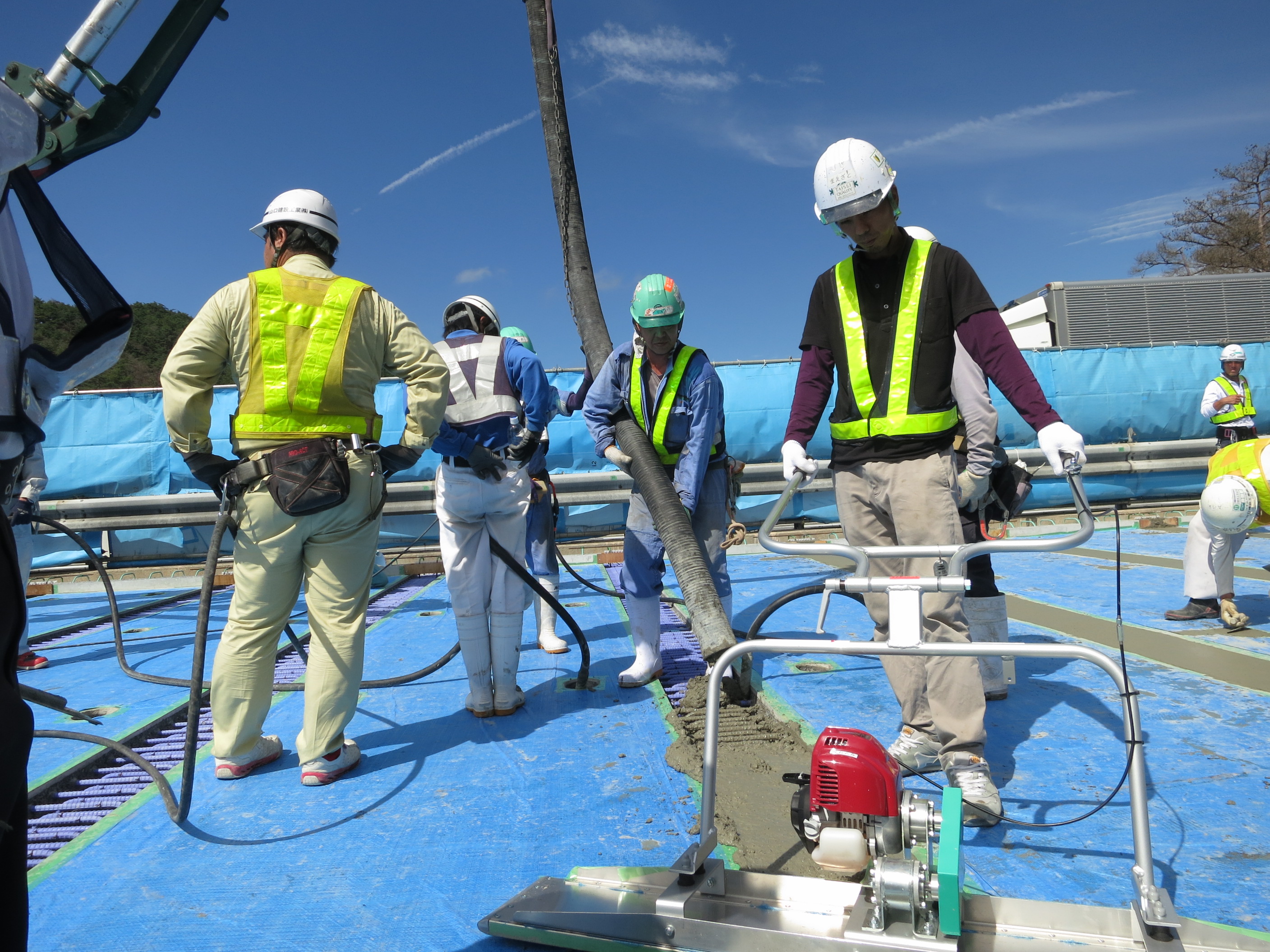 間詰め部の施工はPCaPC床版が全数設置された後にA2からA1方向に向けて順次施工する。間詰め部は現場打ちのため(PCa部材である床版本体に比べて)構造上劣化しやすい。また現場のIC間距離が23㎞と長く、かつ山間部にあり、プラントからの輸送時間が約45分かかる。そのため「要求品質であるスランプ12㌢で50Nのコンクリートを配管圧送することはリスク(暑中時期、圧送スランプロスによる閉塞)が高いため、間詰コンクリートの打設は、敷設したPcaPC床版上にゴムマット+渡り板(専用設計)を敷設してA1側よりアジテータ車を進入させてA2→A1方向へ随時打設していく方法を計画した。また間詰コンクリートの品質確保のために、ジュウテンダーによる締固め管理による床版表層部の品質向上を図った」としている(横河ブリッジ)。