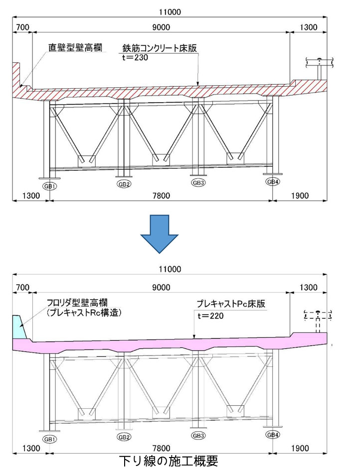 そのため継手構造となるループ筋および橋軸直角方向の配筋にエポキシ樹脂塗装鉄筋を配置するほか、コンクリート強度も50N/平方㍉とし耐久性の向上に配慮している。