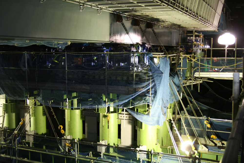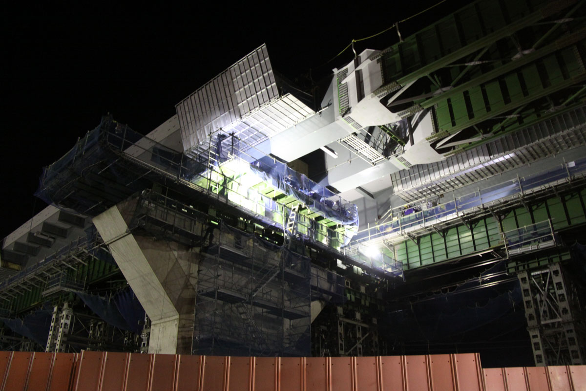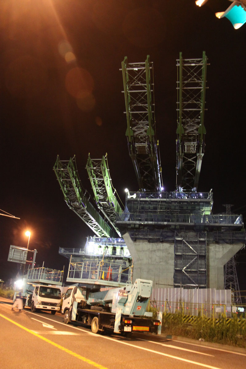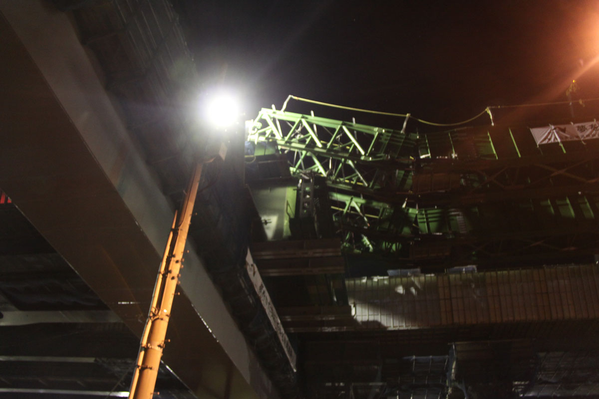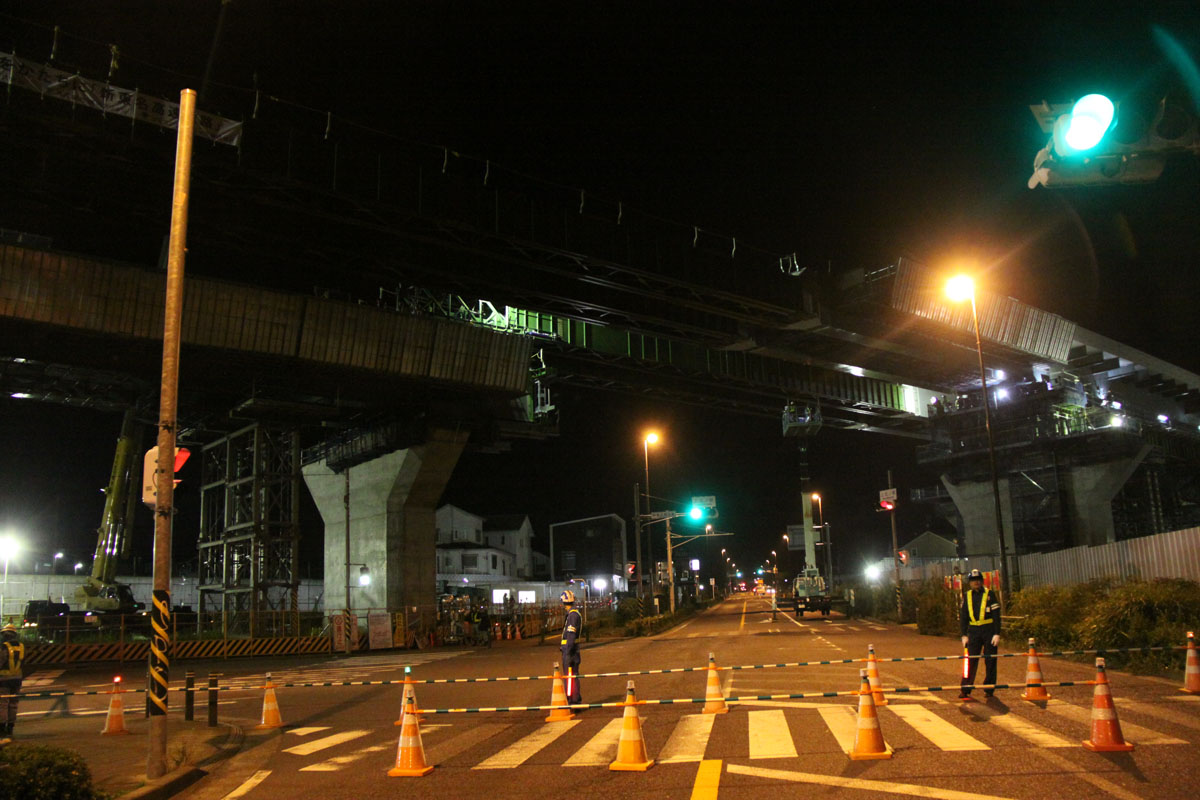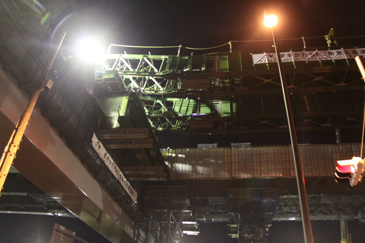 架設はスムーズに進み、下り線は2時46分ごろ、上り線も3時頃に桁が到達し、既設桁上のガイドレールに手延べ桁先端を接続し、到達側のエンドレスローラー上に誘導するとともに、反力を利用して先端部を上昇させ、最大2.4㍍に達するたわみを取り除いた。その後、所定の位置まで送り出した後、桁を本体構造物に仮固定して工事を完了した。