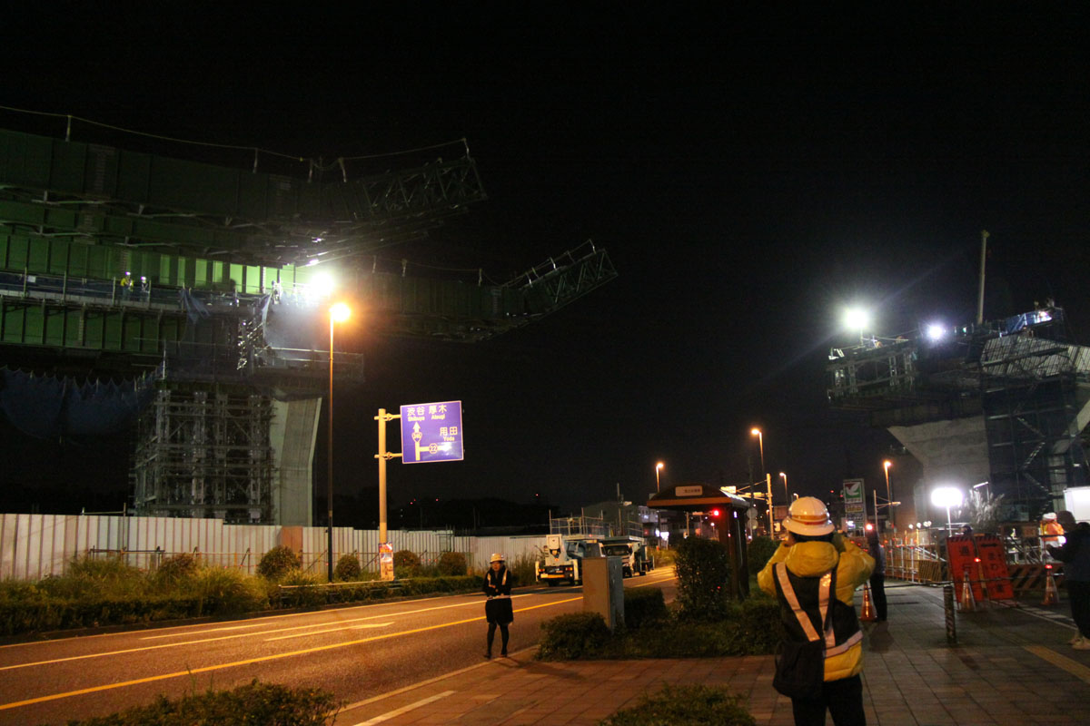 初日夜の工事ではこのうち上下線とも90㍍ずつ送り出し、翌日夜に残りを送り出す。さらに12月3日に桁降下を行い、10日に微調整を施し完成というスケジュールだ。