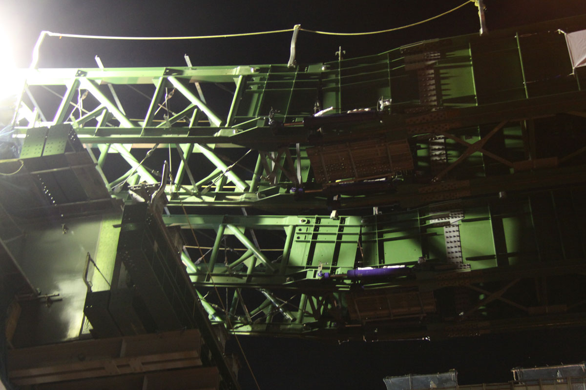 製作・架設は横河ブリッジ・JFEエンジニアリング。一次下請はみなと(架設)など。今回の夜間架設ではJVの職員・架設鳶などの職人合わせて170人(警備込み)が従事した。