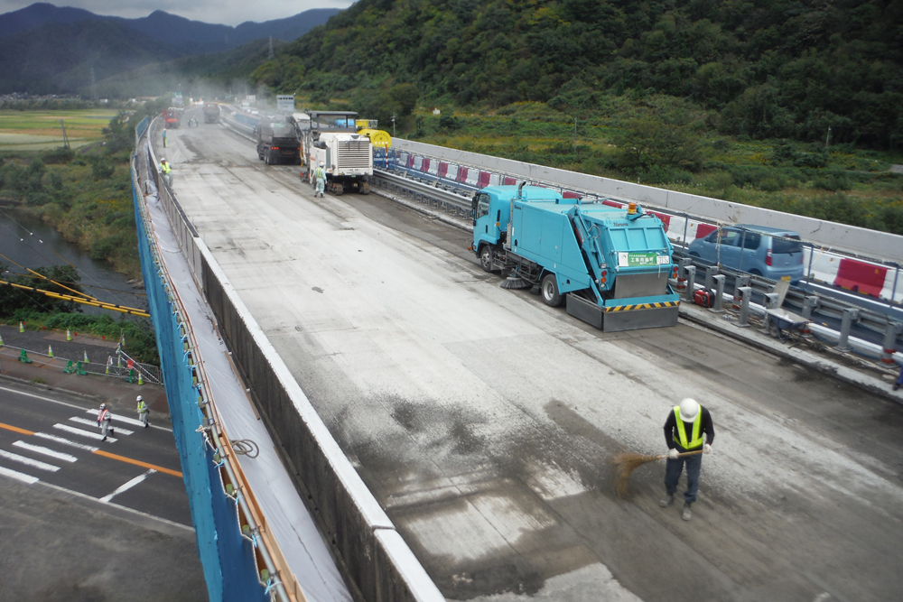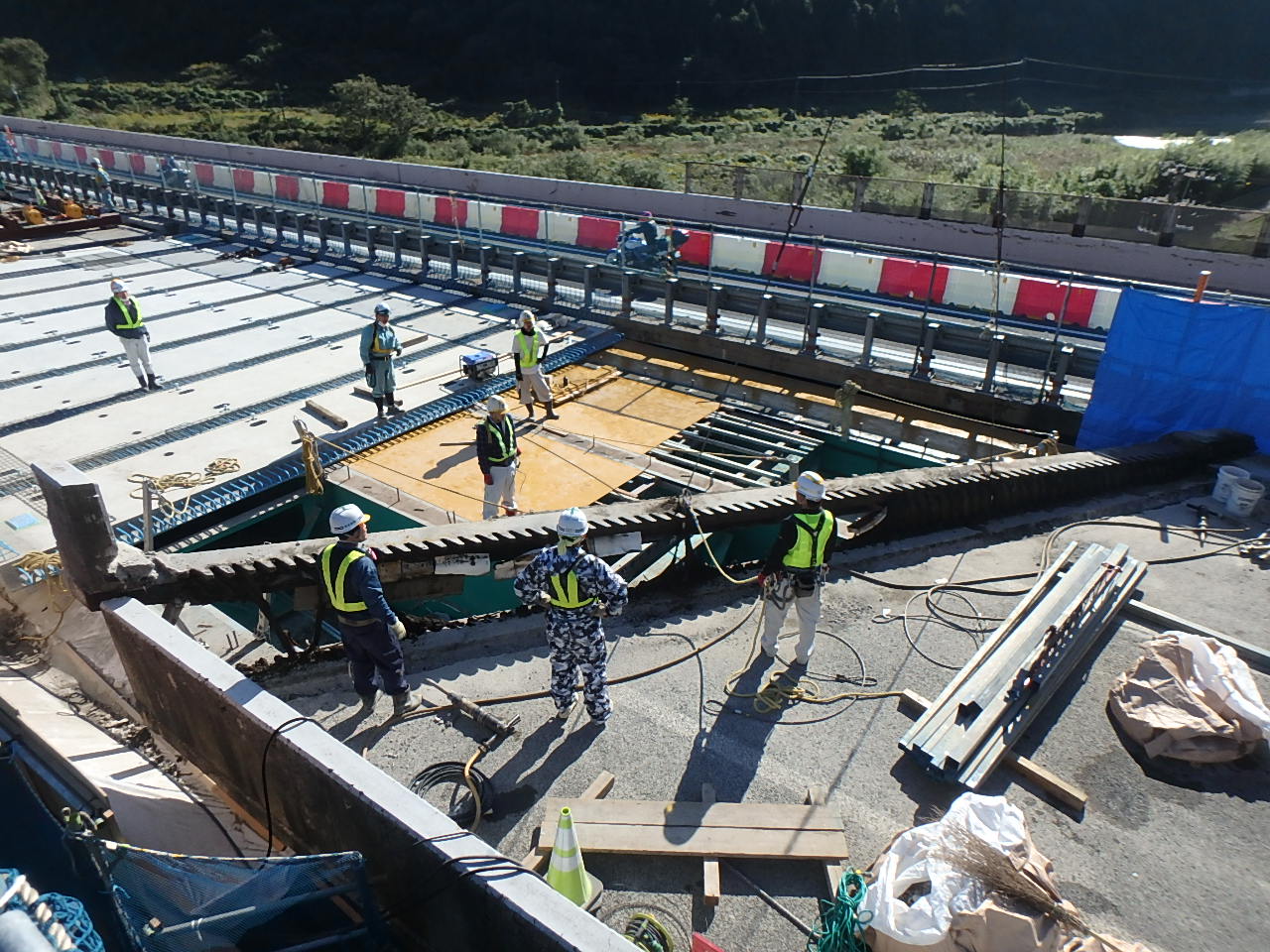 同橋は1977年12月の供用時(床版厚220㍉)に床版防水を設置しておらず、99年に行った床版増厚(鉄筋裏10㍉を含む50㍉をはつり40㍉増厚)の際に初めて防水工(現在のGⅠ相当)を施工した。床版下面にはコンクリートの浮きや剥離が生じており、上面も08年に路面を切削したところ、局部的な浮きや剥離が生じていた。一部では増厚界面の層間剥離も確認されている。また、凍結防止剤を含む漏水の影響により、主桁や対傾構にも錆が発生している。こうした損傷状況から床版及び排水溝の取替、ジョイントの交換(止水化)、鋼桁の再塗装を行うものだ。工期は16年2月23日から17年7月16日までの510日間。契約金額は5億8,320万円(税込)。