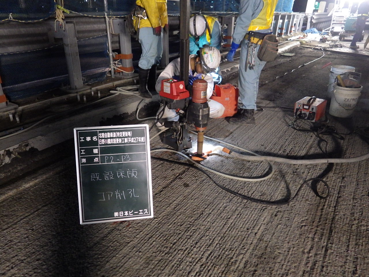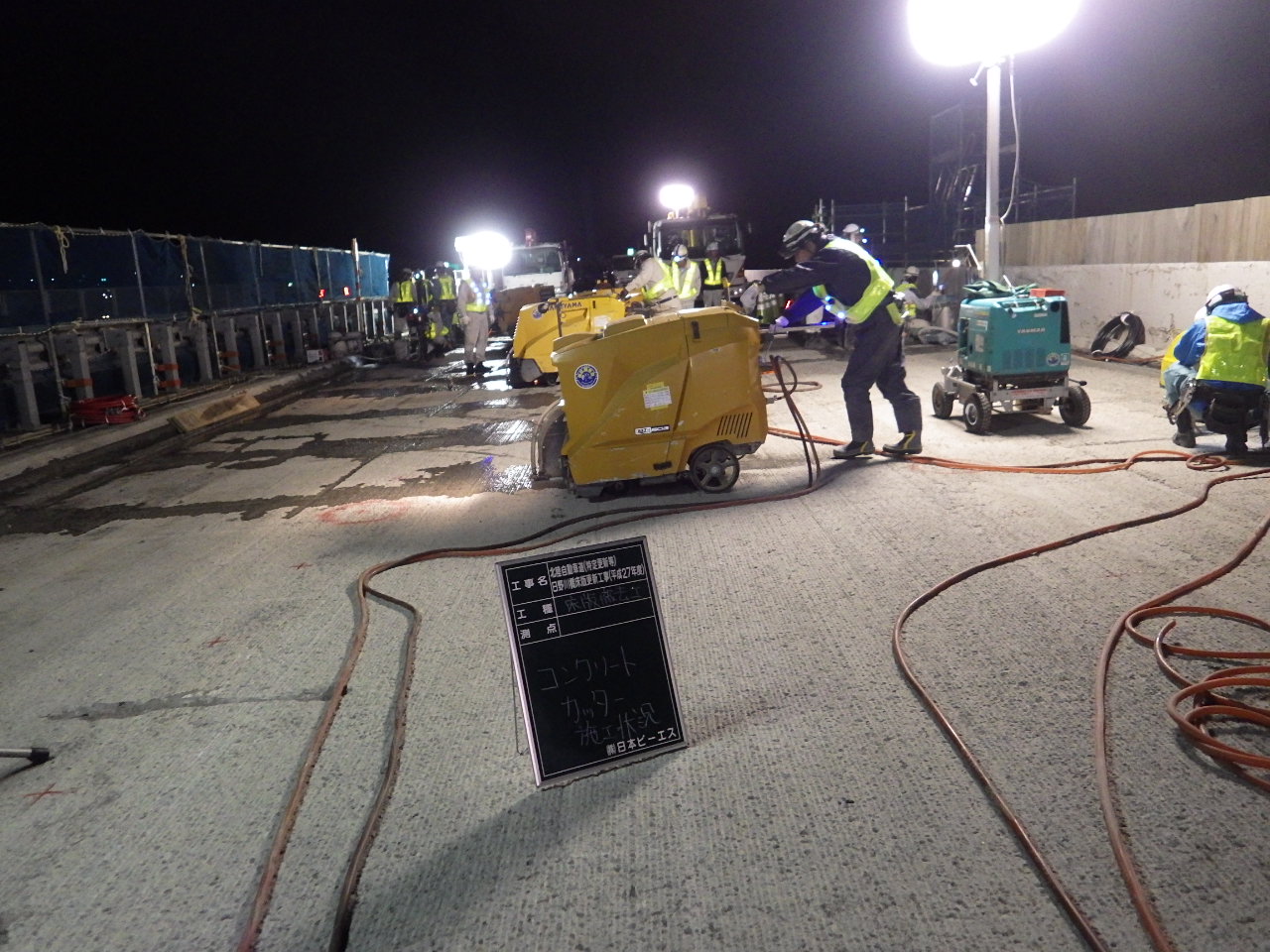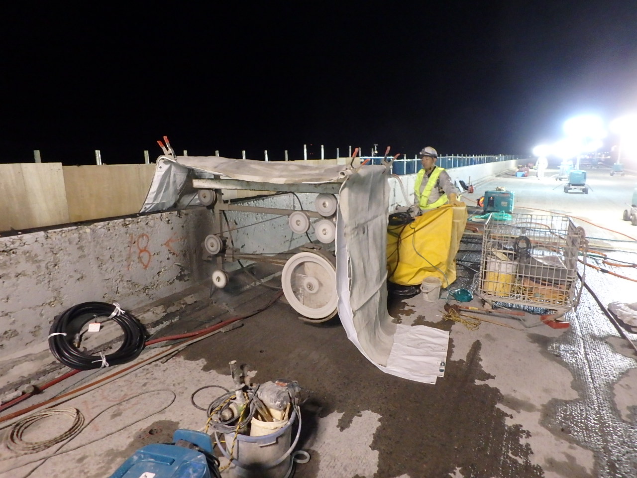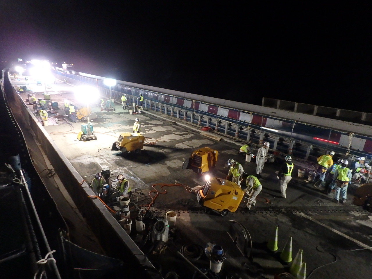 施工は200㌧トラッククレーンを用いてP2側からP5側へ片押しする手順で施工する。1日当たり昼間に16枚(1枚当たり橋軸方向2㍍×橋軸直角方向5.6㍍、重さ約6㌧)の既設床版をダイヤモンドカッターやワイヤーソーで切断し、ジャッキで主桁との縁を切り、クレーンを用いて撤去する。次いで夜間に2×10.9㍍のパネル(厚さ240㍉、重さ11.6㌧)を8枚設置するという工程を繰り返していく。同橋は60°の斜角を有するが、パネル(50枚)は直行に配置し、両端部に残った斜角のきつい部分(P2側:幅10.9㍍×長さ2.71~10.288㍍=面積71平方㍍、P5側:幅10.9㍍×長さ2.705~9.011㍍=面積64平方㍍)はRC床版を現場打ち(厚さ291㍉)施工することで対応する。現場打ち部については、まずP2側から施工し、問題点を洗い出してP5側の施工に反映する。こうした手法を用いることで手戻りなどを極力排するとともに、工種のラップをなくすることで、安全性の確保にも努めている。