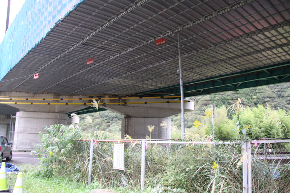 床版の取替は、10月12日~10月31日までの間、下り線を全面通行止めし、上り線を615㍍長対面通行に規制した上で施工した。交差路線として国道365号があり、足場は簡易かつ手早く組み立て可能なスパイダーパネルを採用している。