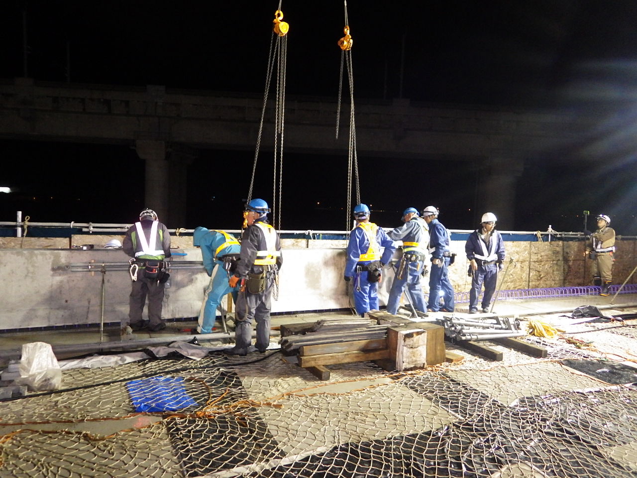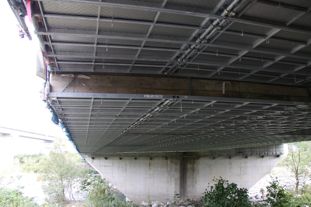 今後は桁の塗り替えなどの工程を進める。塗り替え対象は桁全面で面積は約7,000平方㍍。ただし、鉛などを含有している可能性があることから何らかの塗膜剥離方法を用いる予定。設計段階は塗膜剥離剤を用いた塗膜除去工法により施工する予定だったが、IH式塗膜剥離機械の採用も検討して行く方針だ。