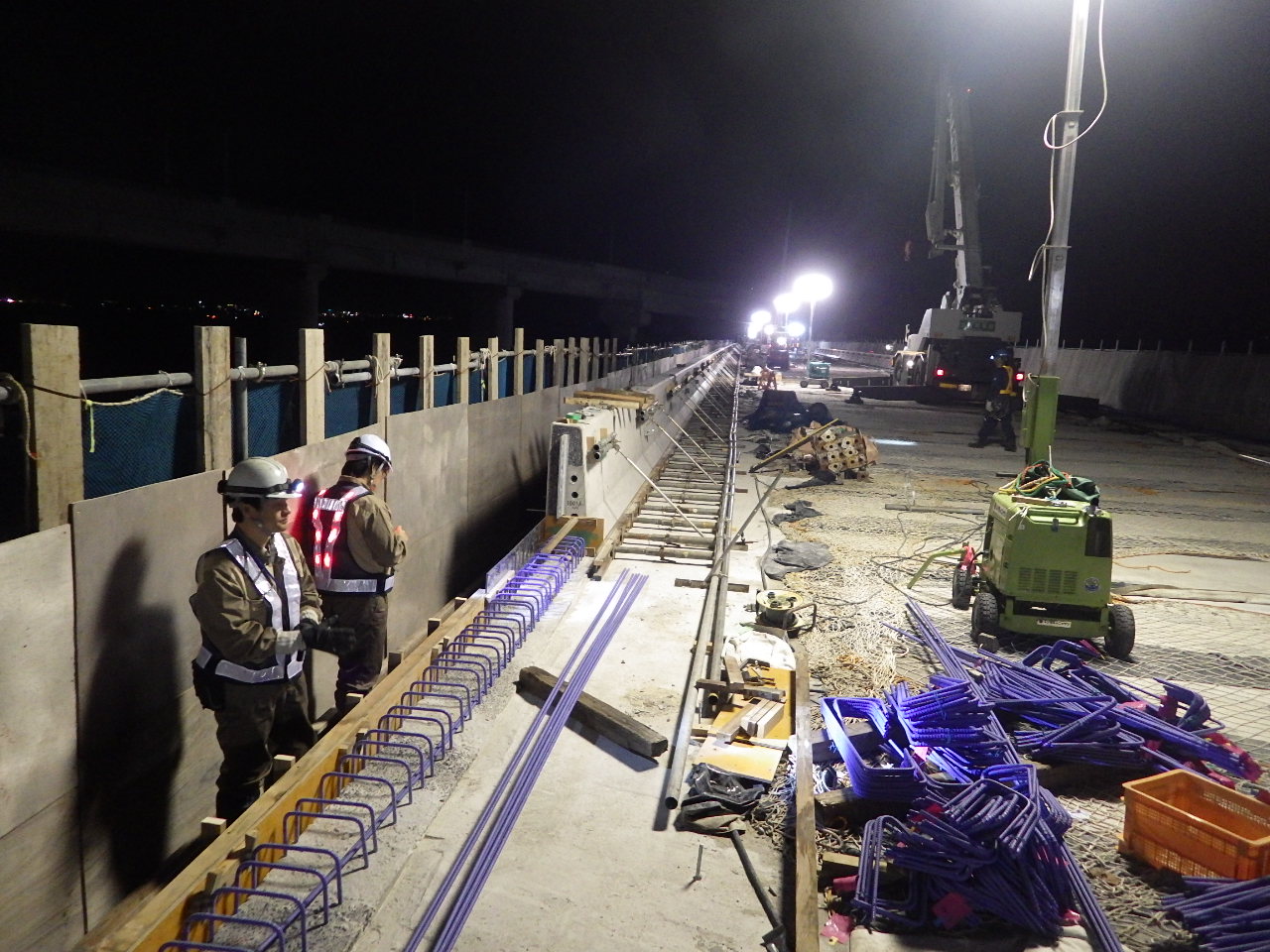 また、高欄は両側ともDAK式プレキャストRC壁高欄を採用した。用宗では1ブロック延長2㍍の同高欄を使ったが、今回は延長4㍍のものを使用している。「もともとDAK式の標準は4㍍であり、それに沿ったもの」(同)。一般にプレキャスト壁高欄は縦横断勾配に配慮した精度の点で課題があり、中間に場所打部を設けて調整するが、ここでは「出来上がりの床版の高さを抑えておいて、調整ボルトの高さをいくつに計画するか、それさえきちんとすれば精度的に問題は生じない」と考え、場所打部を設けないで施工するよう計画した。その結果、200㍍弱×両側の延長を2昼夜で全て架設することができ、従来の場所打に比べ工程を6日程度短縮した。またDAK式高欄と地覆を繋ぐ部分の間詰め部分は品質管理のため厚さ12㍉の透明型枠を採用し、打設状況を目視確認できるようにして施工している。