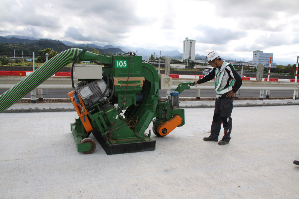 (右)ショットブラストは投射密度100㌔/平方㍍で施工した(井手迫瑞樹撮影)