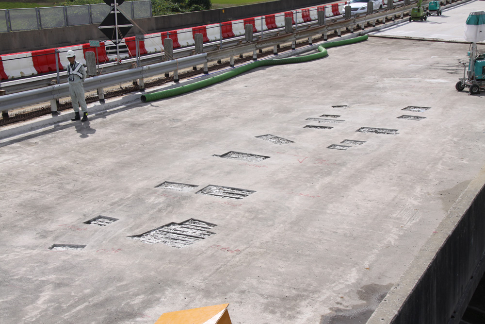 (左)A1~P5側は上面の損傷部をはつってショットブラストし、PD工法を用いて断面修復した(井手迫瑞樹撮影)
