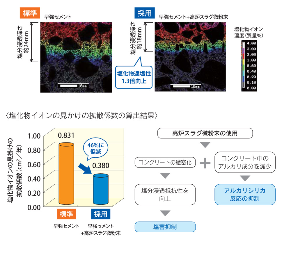 コンクリートは高炉スラグを混入し、塩害やASRに対応している。間詰めコンクリートも高炉スラグコンクリートを採用しており、ひび割れ対策として膨張材を用いている。間詰め幅は合理化継手法式を採用することで280㍉まで短くし、耐久性上弱点になる面積を狭めている。また、継手部の鉄筋端部にはステンレス製のナットを装着しており、これが引き抜き力を分担することで間詰め部の長さを短くすることができている。橋軸直角方向の鉄筋は合理化継手の上下に配置している。なお(主桁上の)ハンチは最小で60㍉、最大で100㍉近く打設している。