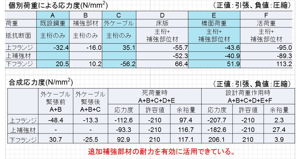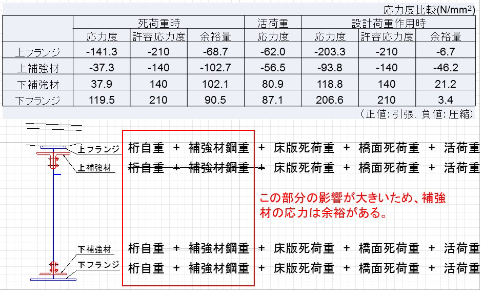 当初の基本設計では、既設床版撤去後に主桁を当て板部材で補強して、前述の荷重に抵抗できる構造とする計画を考案していた。しかし、この方法では、死荷重作用時の既設主桁と補強部材の応力差が大きく、補強部材のもつ耐力を有効に活用できず、(必要耐力を稼ぐために)補強部材が大型化し、上フランジだけでなく下フランジにも補強部材を取り付けなくてはならず(下表)、工期の面でも、鋼部材補強だけで40日程度も必要となり、集中工事期間内で対応完了が難しくなるという課題があった。