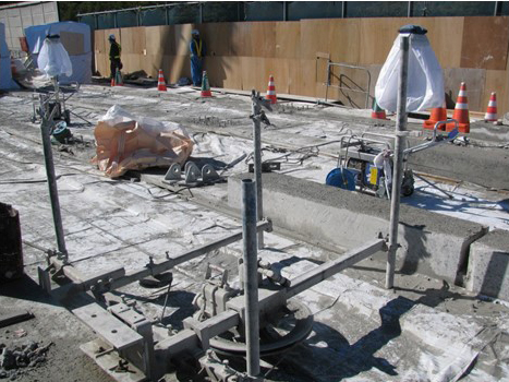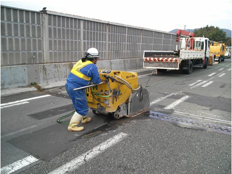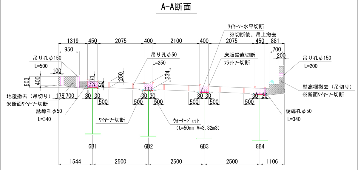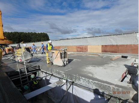 集中工事期間内の現場では、まず初めに桁間の中間床版(4主桁のため全幅員を桁上を除き3つに分割した方で切断撤去していく)・路肩壁高欄・中央分離帯地覆を120㌧クレーンによって吊切りを行った。桁間の床版サイズは橋軸方向4.5~5.748㍍×直角方向2.31㍍で重量は7.5~8.5㌧。桁間の床版については、主桁上フランジをカッター切断時に損傷させないようにフランジから5㌢程度離隔を確保して切断を行っている。その上で主桁上に残った既設床版は、上フランジ天端より5㌢程度を狙って水平方向のワイヤーソー切断を行い、ブロック状にクレーンを用いて撤去している。最後にフランジ上に残った5㌢程度厚さのコンクリートは主桁に損傷を与えないようウォータージェット(WJ)による斫りを行い、最後に残った上フランジ上面のスタッドを切断して、撤去工を完了した。