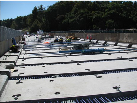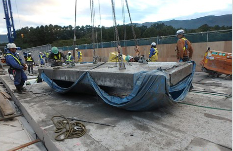 桁補強後は、220㌧クレーンを用いて、210㍉厚のプレキャストPCパネル19枚(1枚約14㌧)をP5側から8枚、P4側から11枚を、P5からP4方向へ順次配置していった。